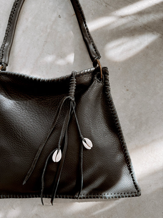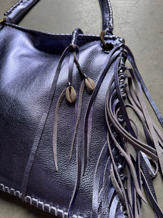 Frankie features a triangular rectangular style tote, in the softest buttery chocolate cowhide, she's so functional/fun! Completely laced from the shoulder to her base and all her edges. Accented with solid brass rings, a great zipper with a fringy tassel with cowrie shells & a floating insert pouch.