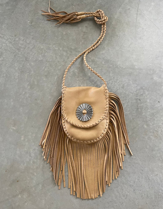 fully laced bag, features a front laced pocket and laced body, laced backside with full 9” fringe around the body. Laced edges and laced eyelets for the braided strap. Two 4 strand round braided straps that you can knot together however you like for your desired length! A fully laced flap with a beautiful large sunburst concho.