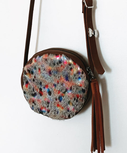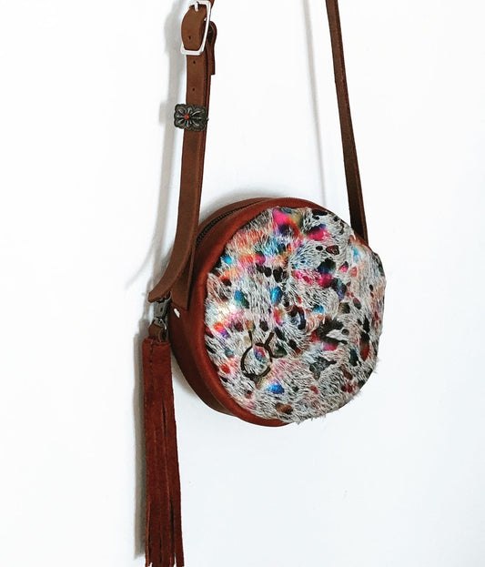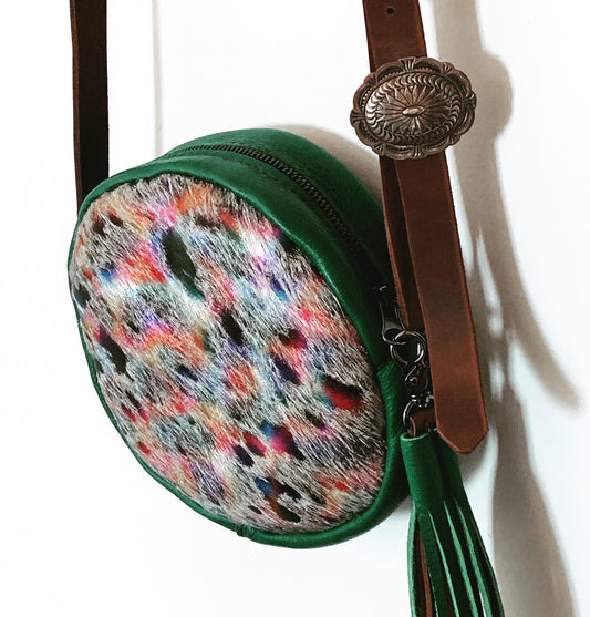 The round sun shape symbol bag with a rainbow acid splash hair on cowhide, reminding me of a winters sun dog in the sky! It’s roomy, 8” round 2” in depth. A thick fringy zipper pull clip. An adjustable crossbody strap with a buckle. Accented with an authentic vintage sterling silver pin.. move it anywhere on the bag you like! Leave it where it’s at, if ya like! -xo