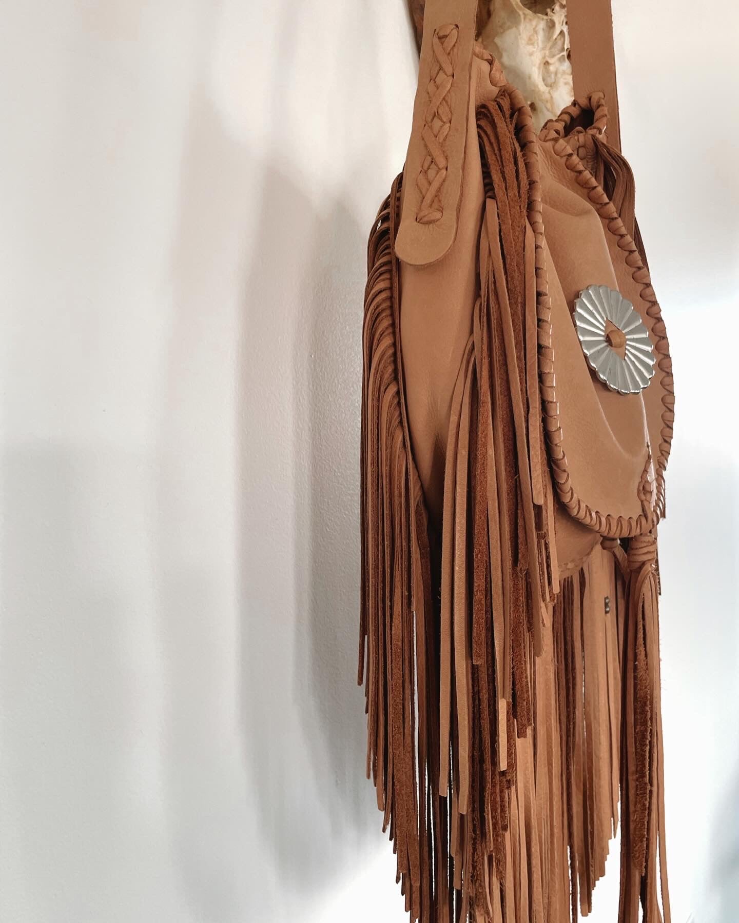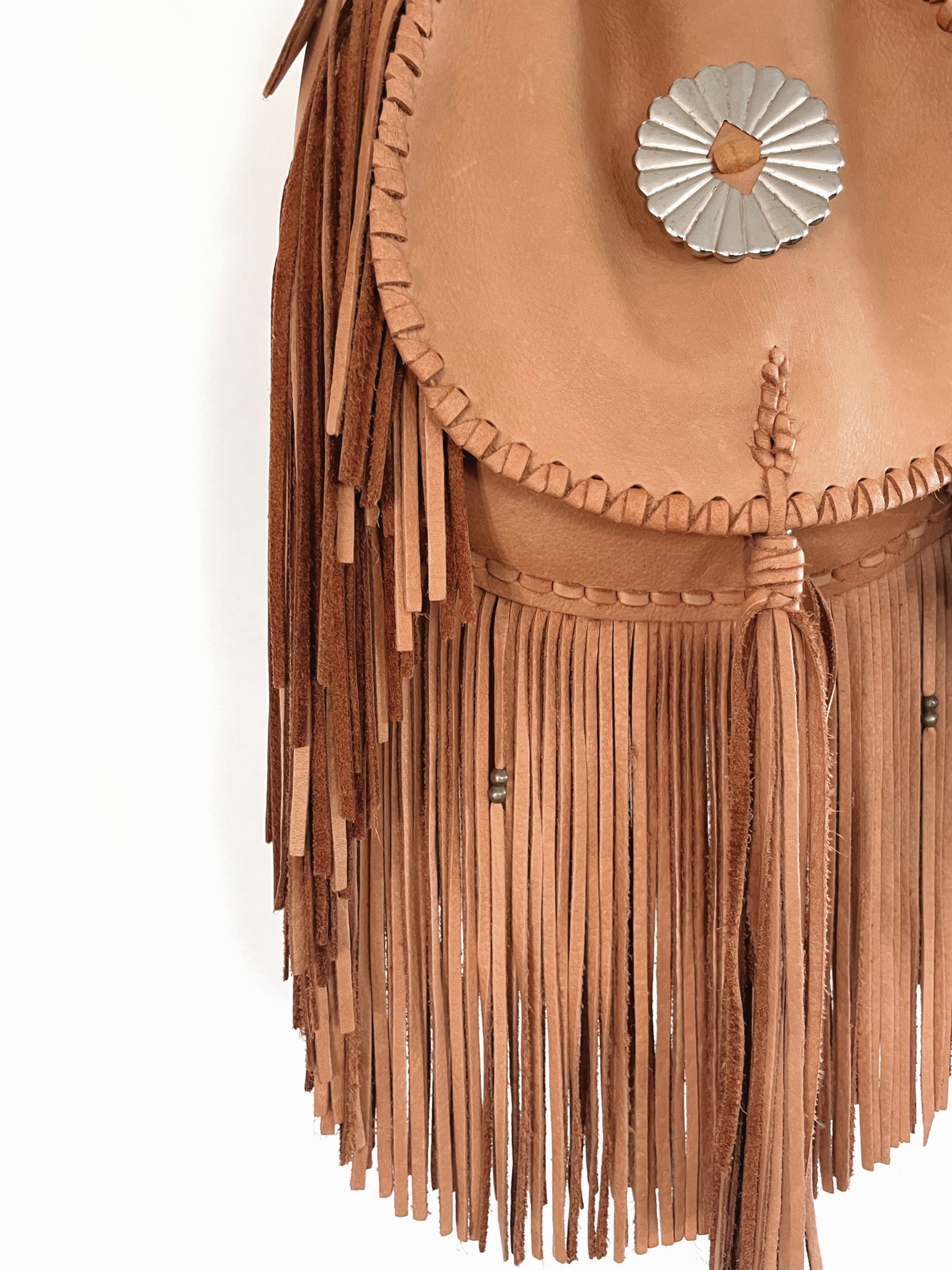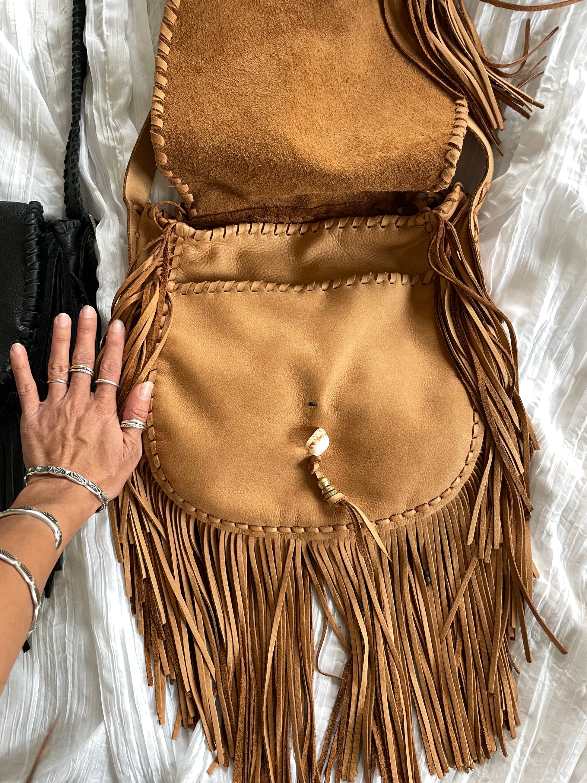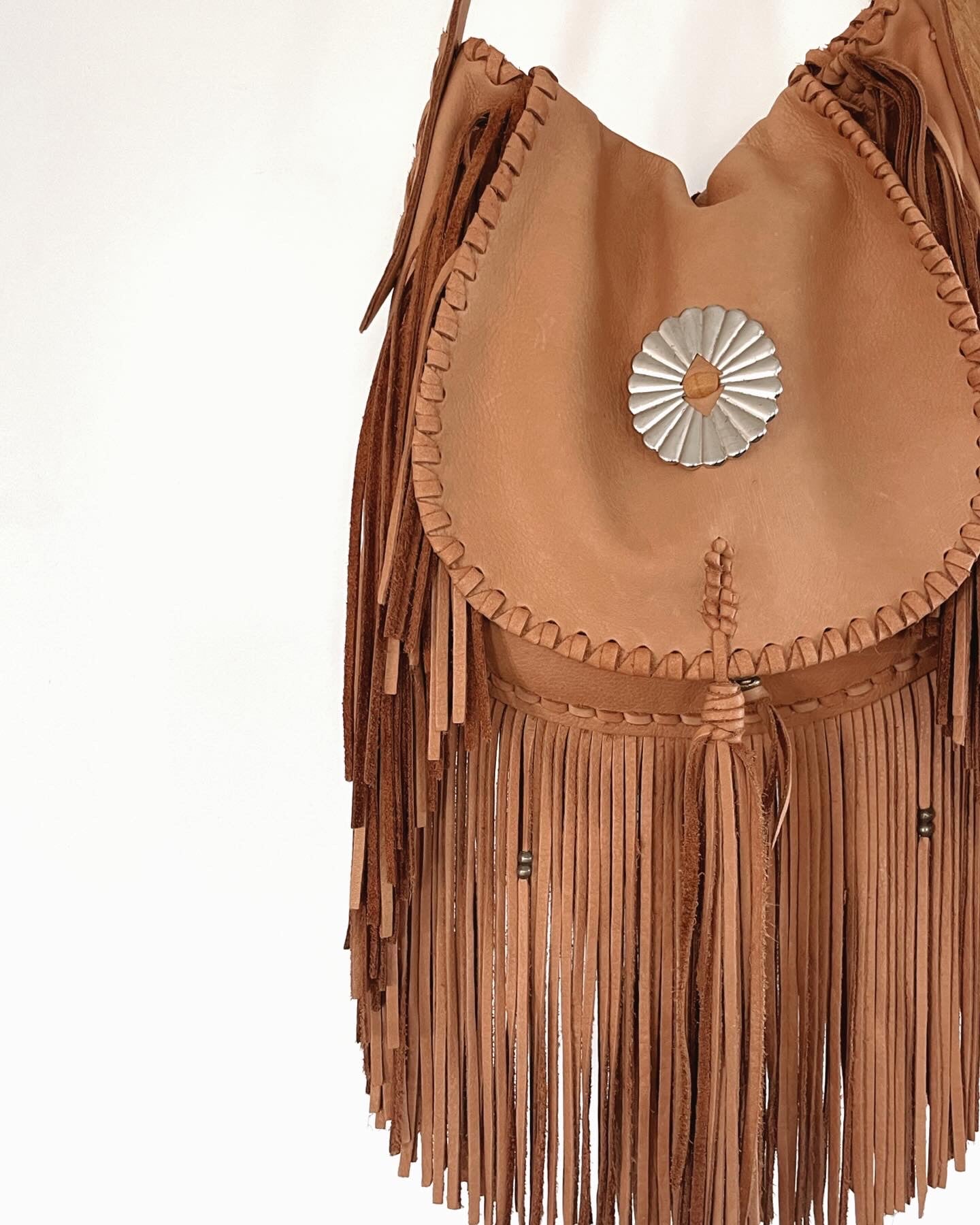 features extra material, two pockets, extra large front pocket and smaller inside pocket. a wide gusset for roomy room. a fixed shoulder strap (is not adjustable, it sits at a vintage length) and DOUBLE the fringe! ( fringe laced on both the front and the back!