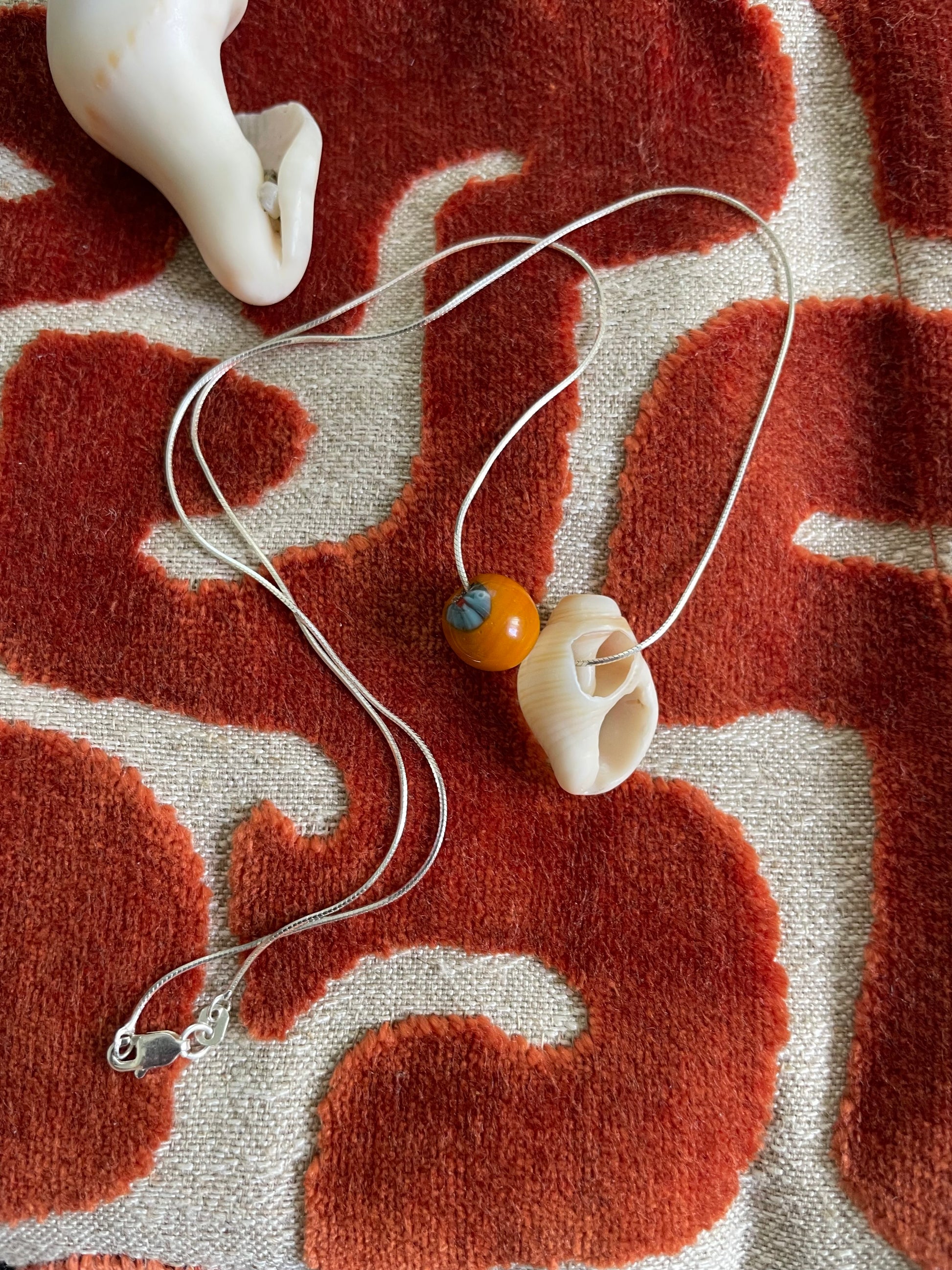 18” snake chain with dainty washed shell and orange flower bead.