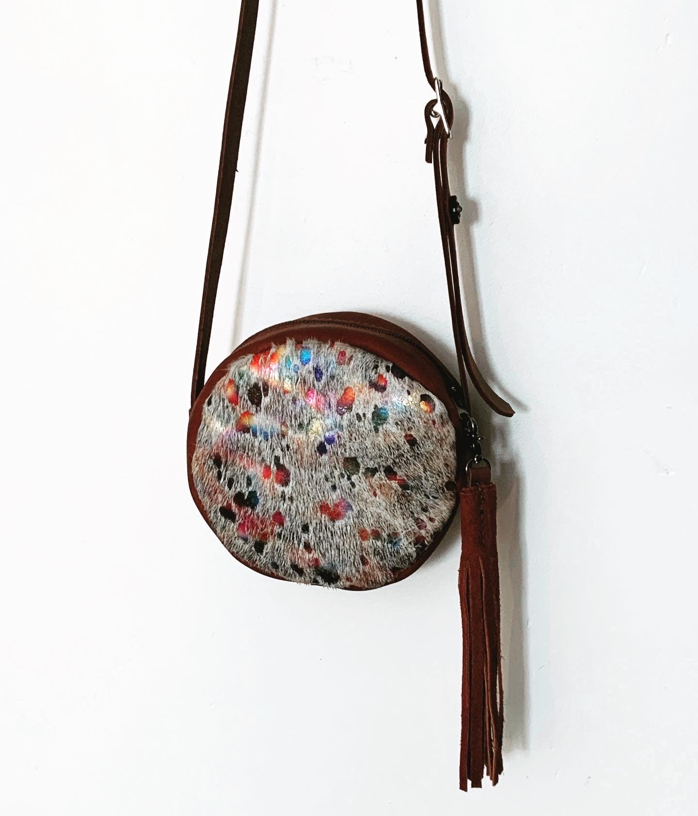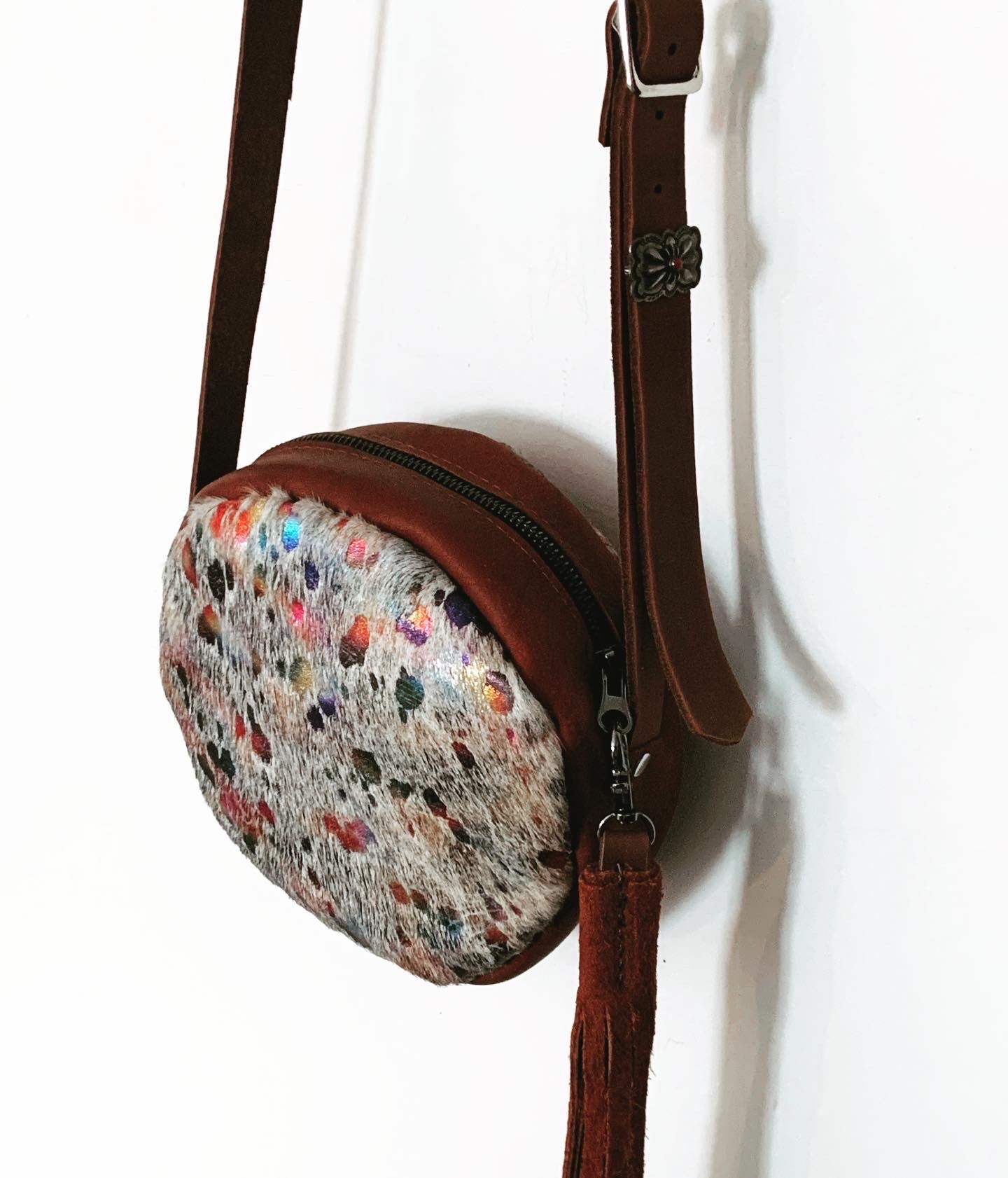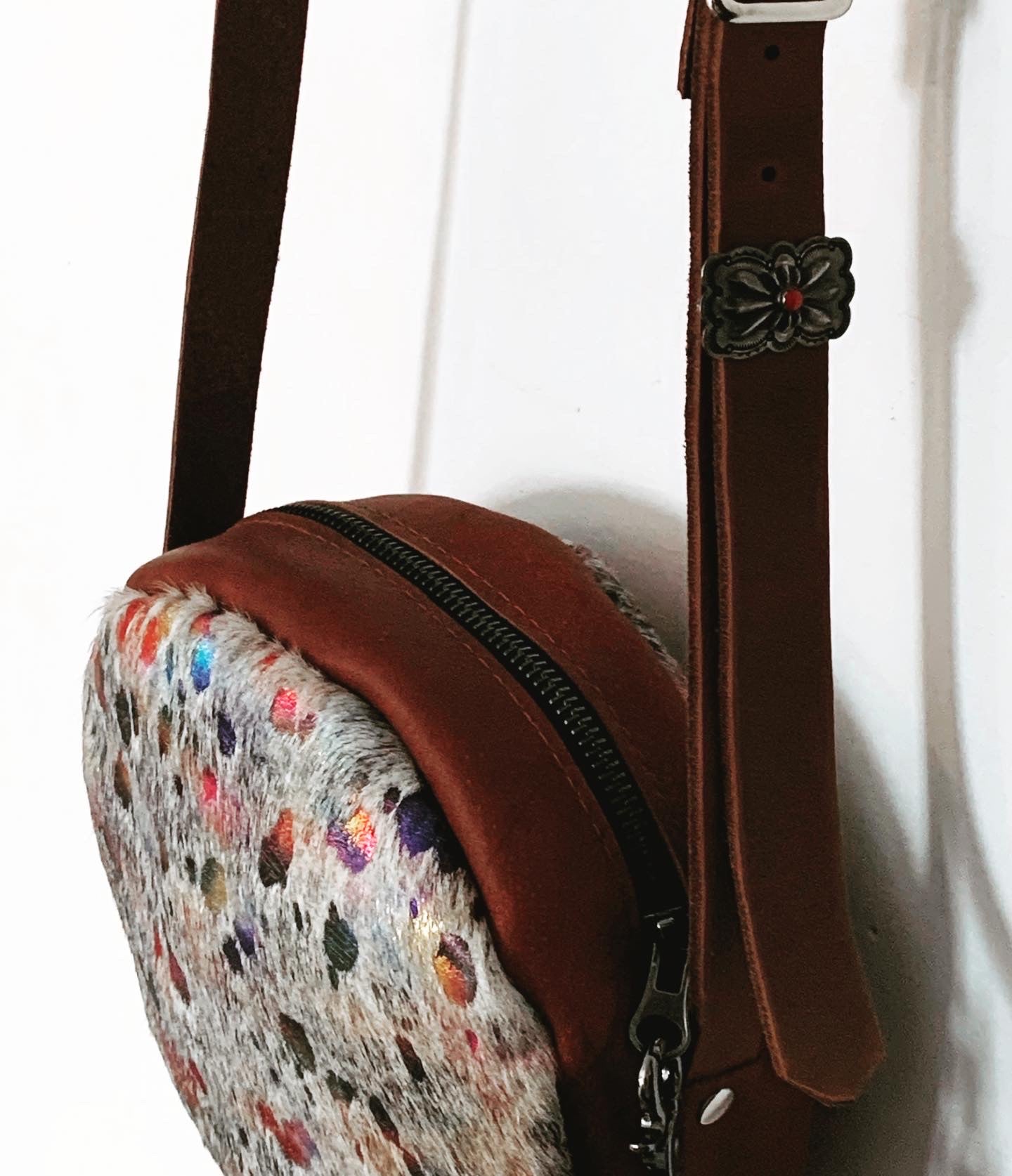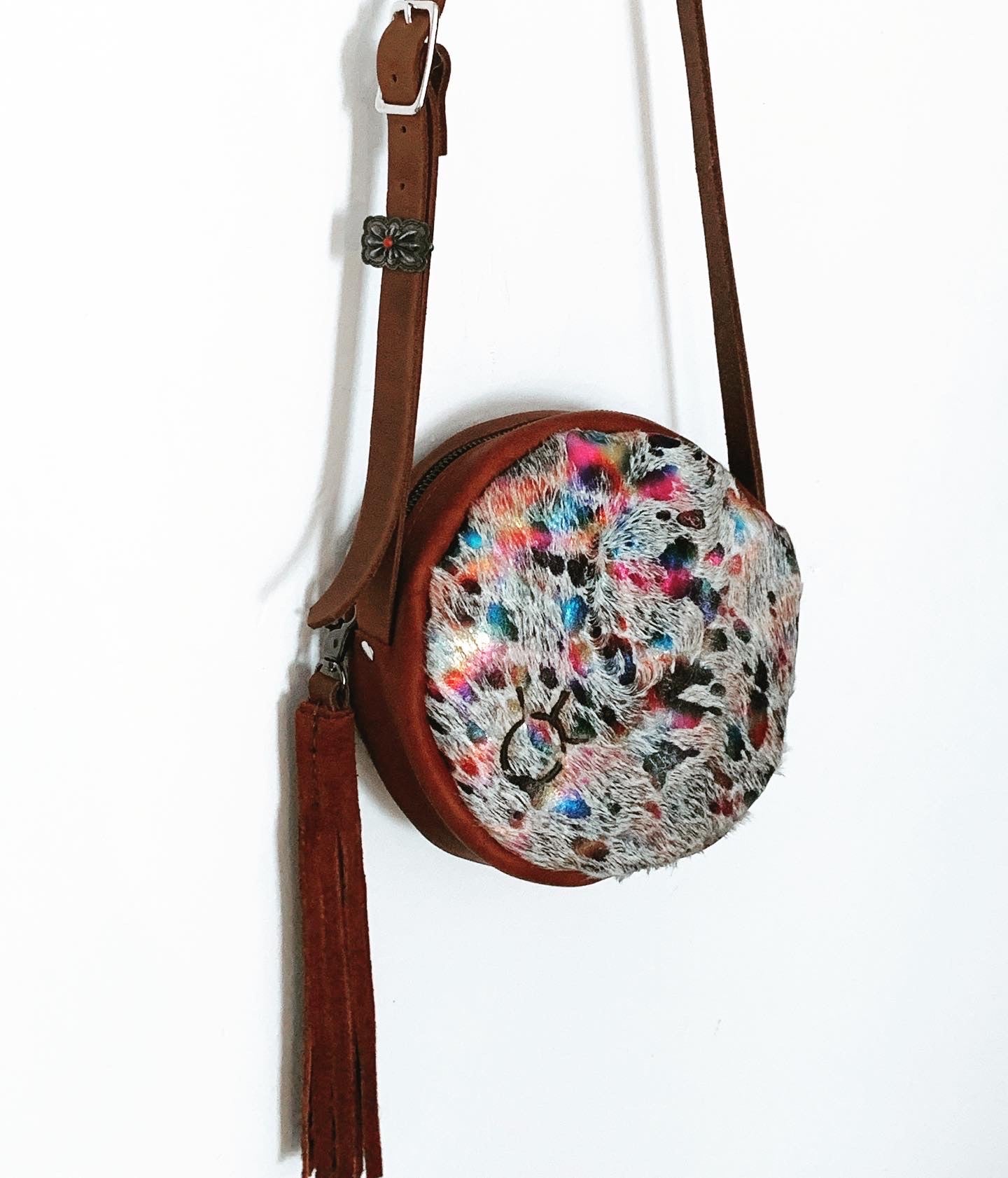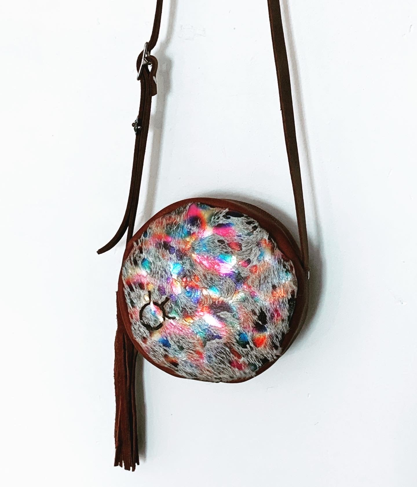The round sun shape symbol bag with a rainbow acid splash hair on cowhide, reminding me of a winters sun dog in the sky! It’s roomy, 8” round 2” in depth. A thick fringy zipper pull clip. An adjustable crossbody strap with a buckle. Accented with an authentic vintage sterling silver and coral pin.. move it anywhere on the bag you like! Leave it where it’s at, if ya like! -xo