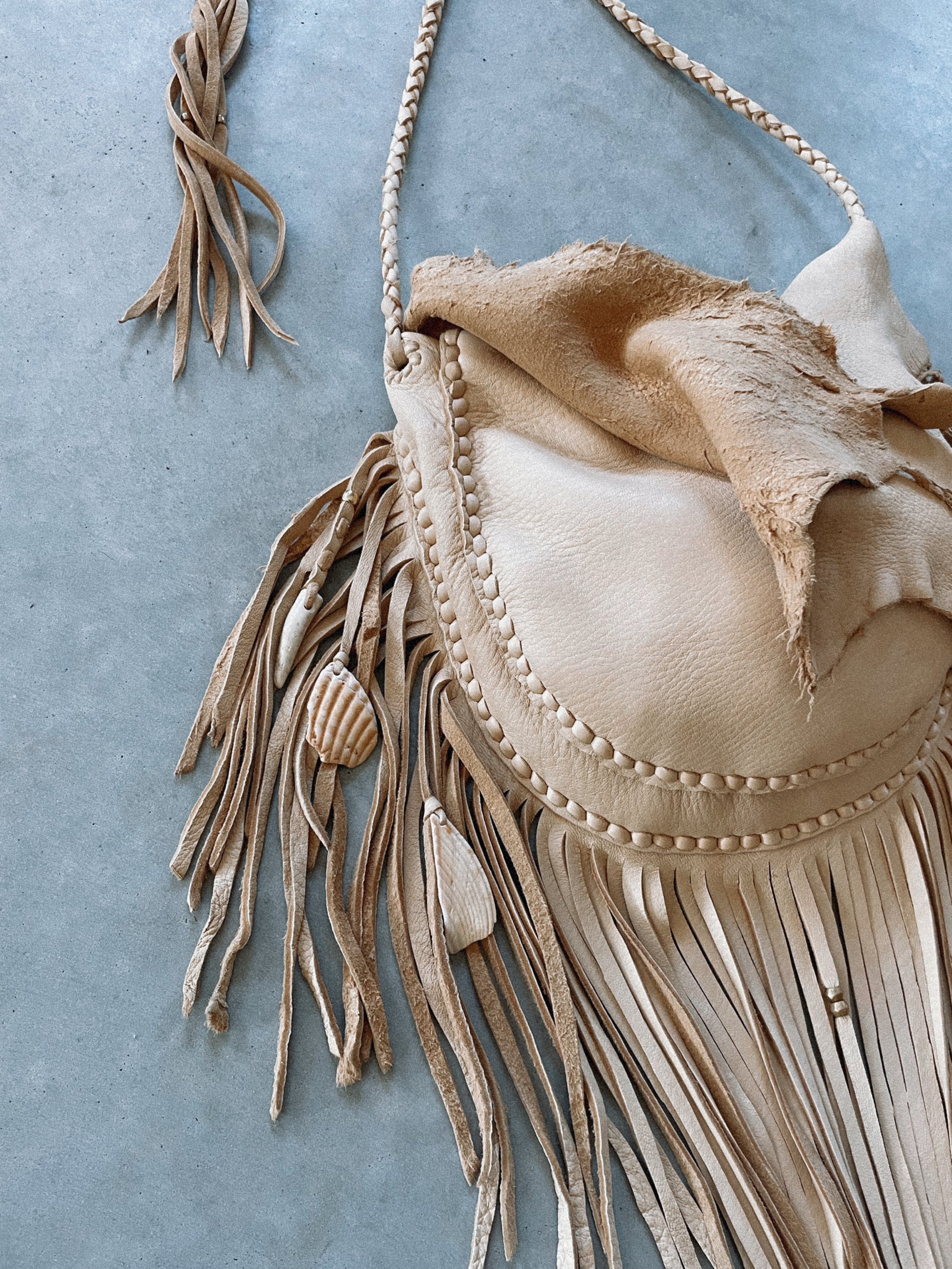 fringe around the entire body of this bag 10-11” fringe, varies towards the top of the bag since using raw shapes of the natural deer hide!