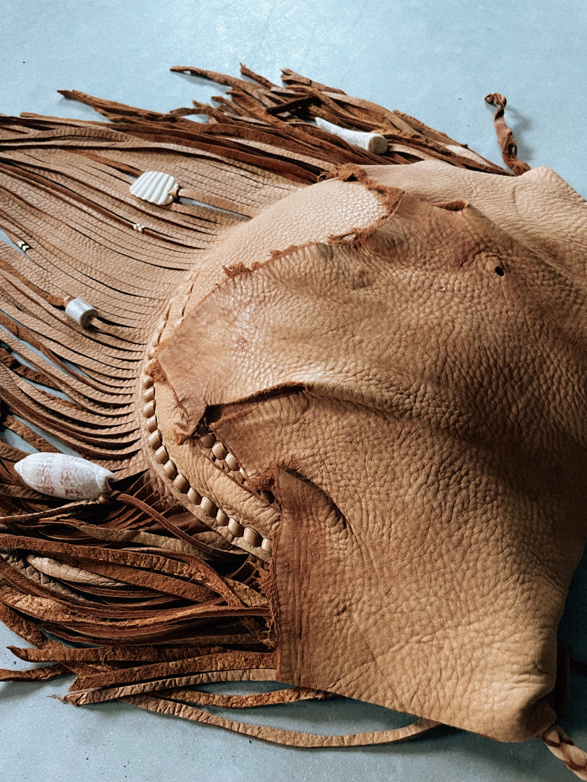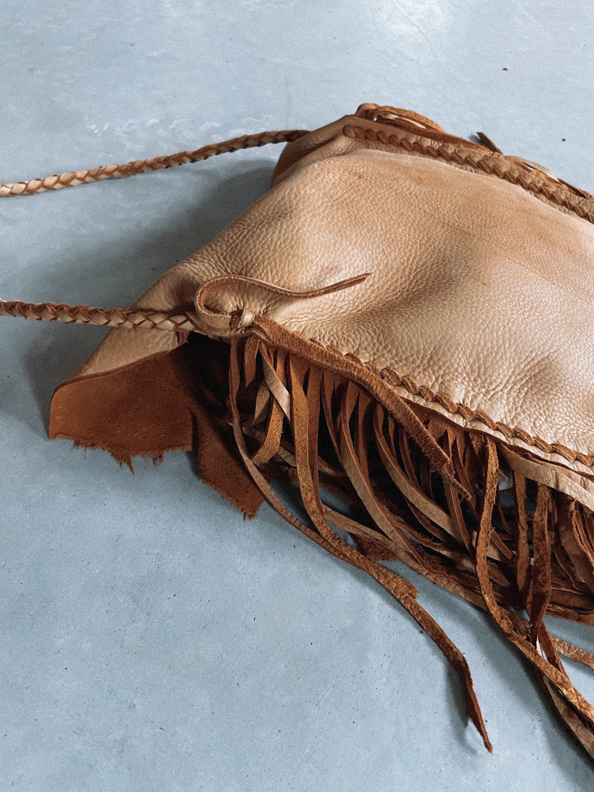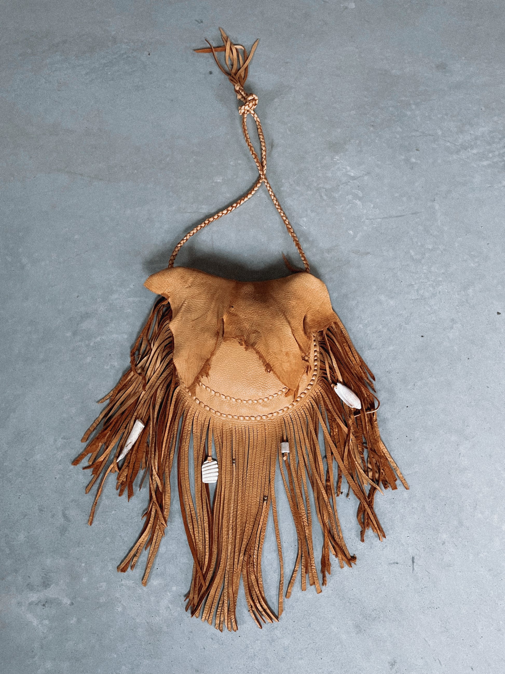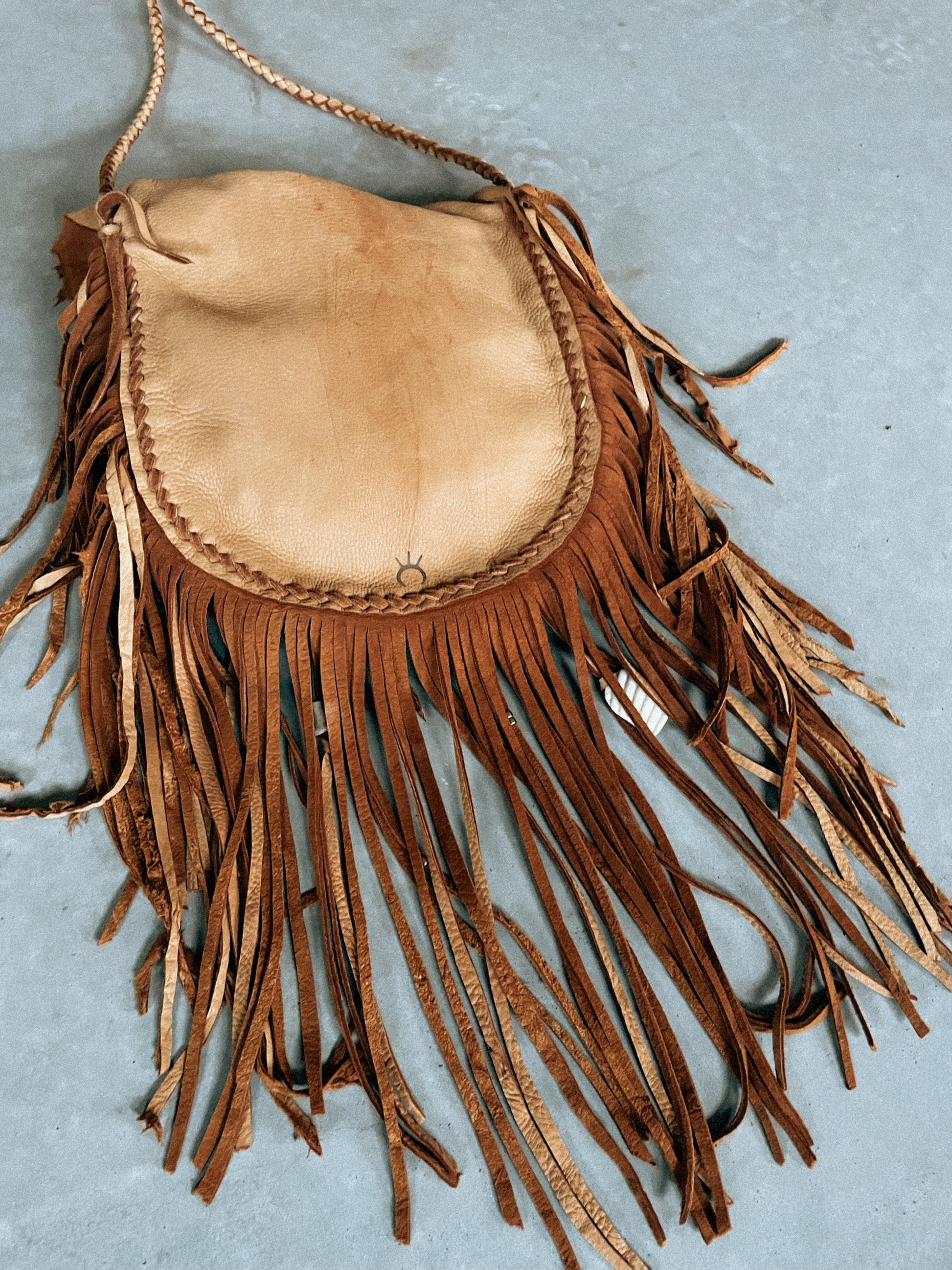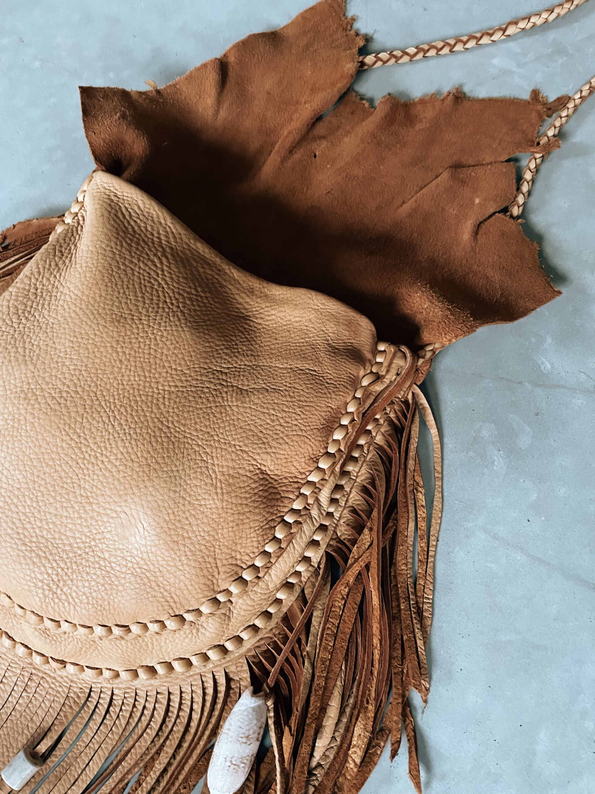 fringe around the entire body of this bag 10-11” fringe, varies towards the top of the bag since using raw shapes of the natural deer hide!
