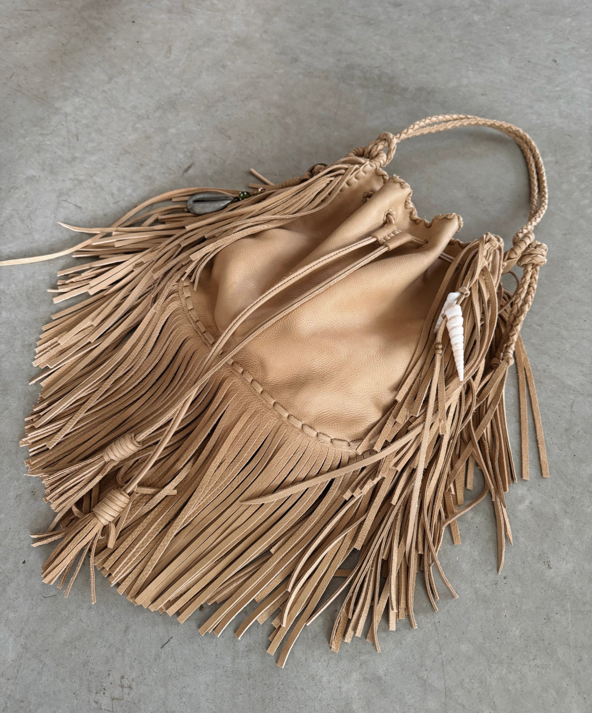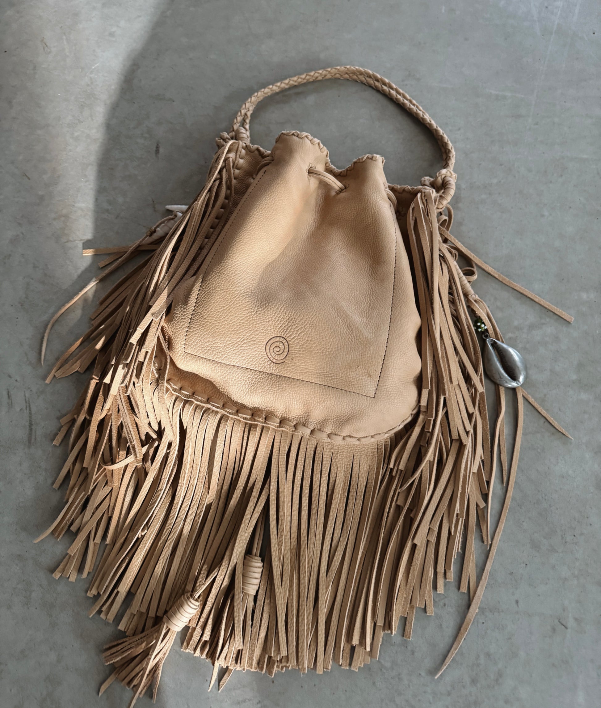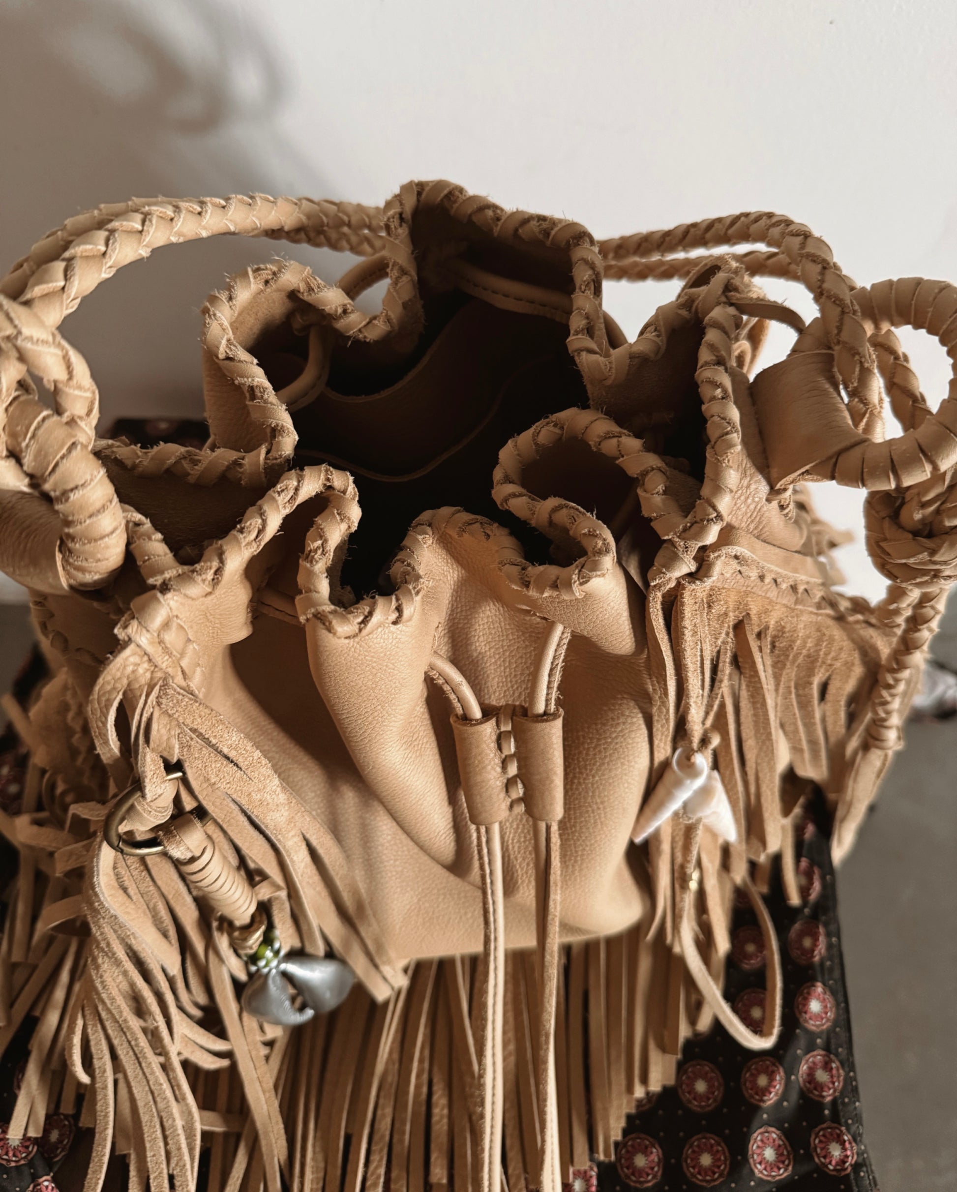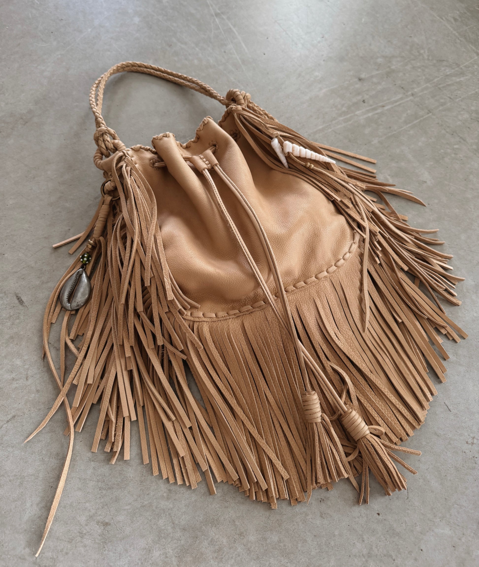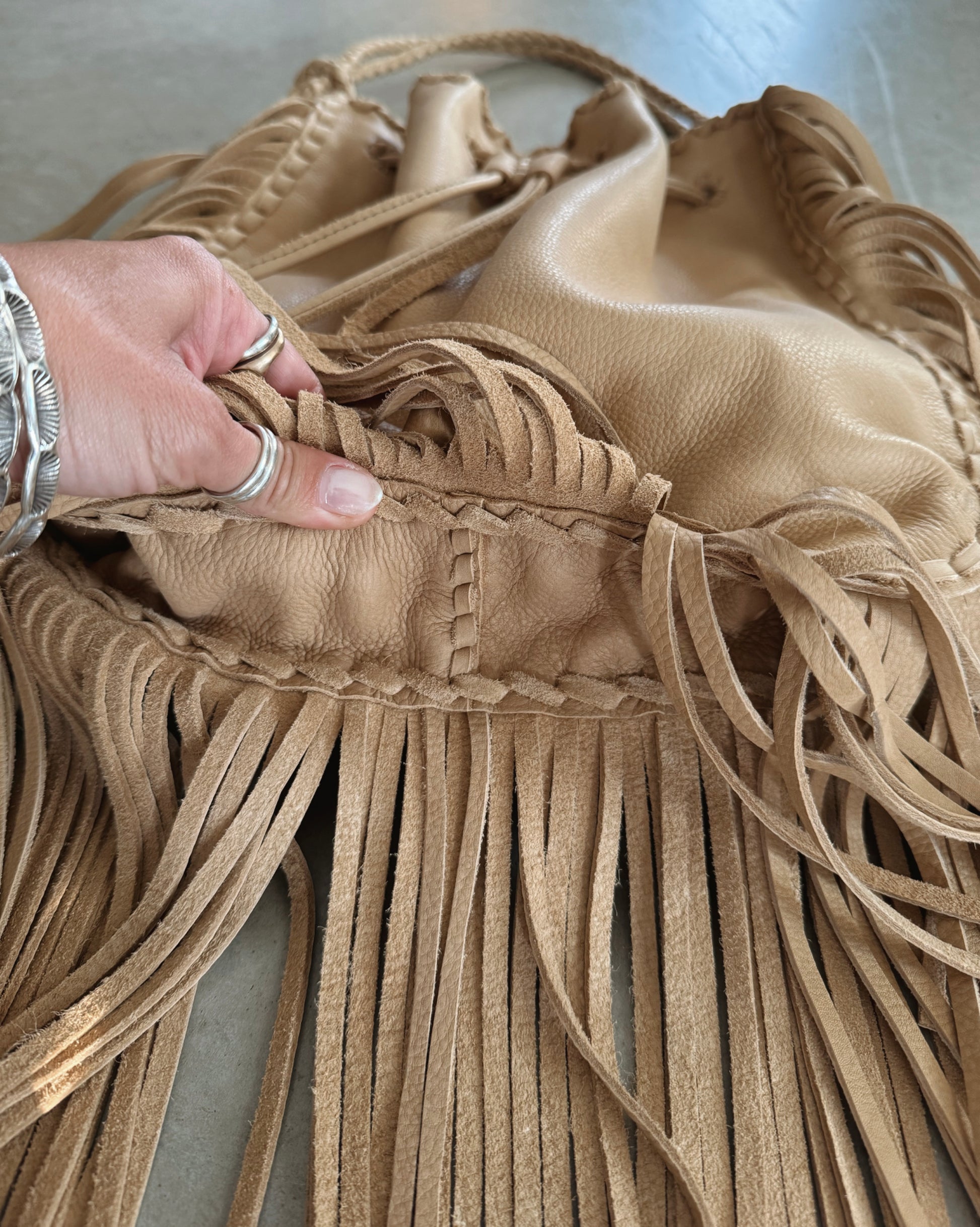 This bag is big!! It’s a tote actually! Lots of room! All hand laced and double the fringe. The bag is laced front to back and laced gusset. The fringe flows from top to bottom, along the entire shape of the bag, front and back. Two pockets on the inside and a drawstring closure outside. Carried by a round braided strap. It’s a short shoulder strap but can be lengthened! Leather wrapped rings, which are sewn then laced to the bag. Fully laced edging along the top of the bag. A full 3” gusset, where a lot of the room comes from. The top of the bag is wider than the bottom to give it a cool shape when worn open or closed.