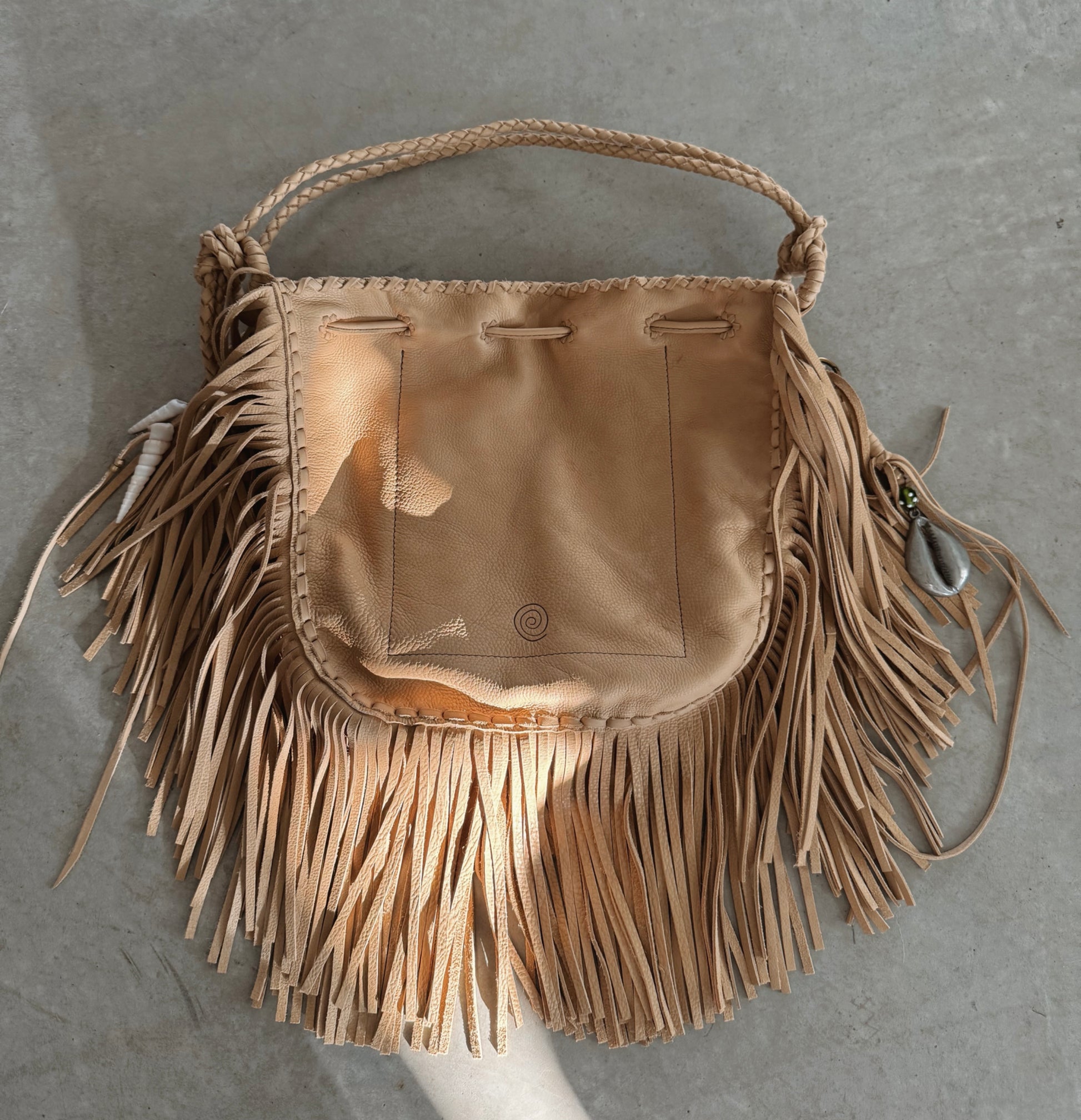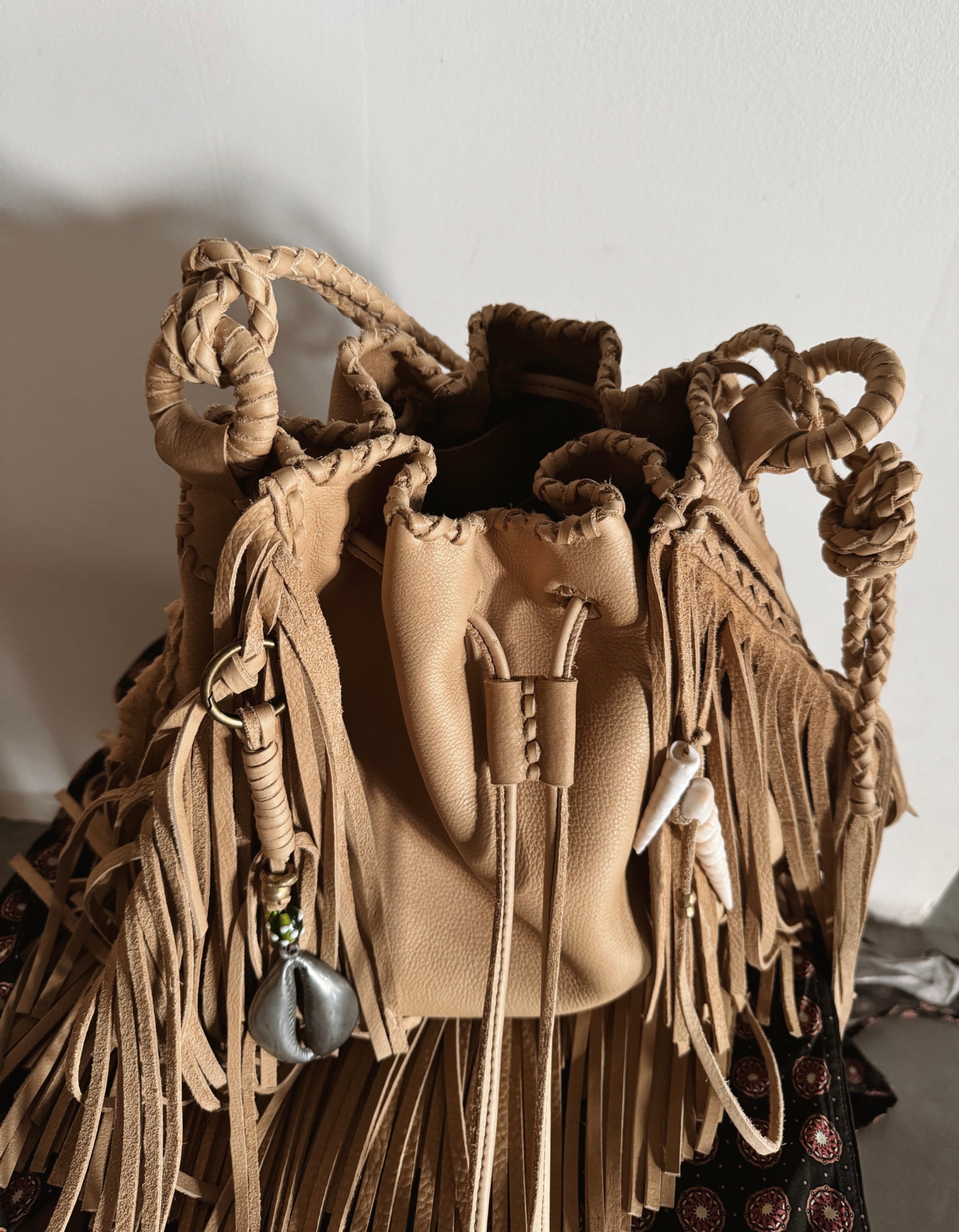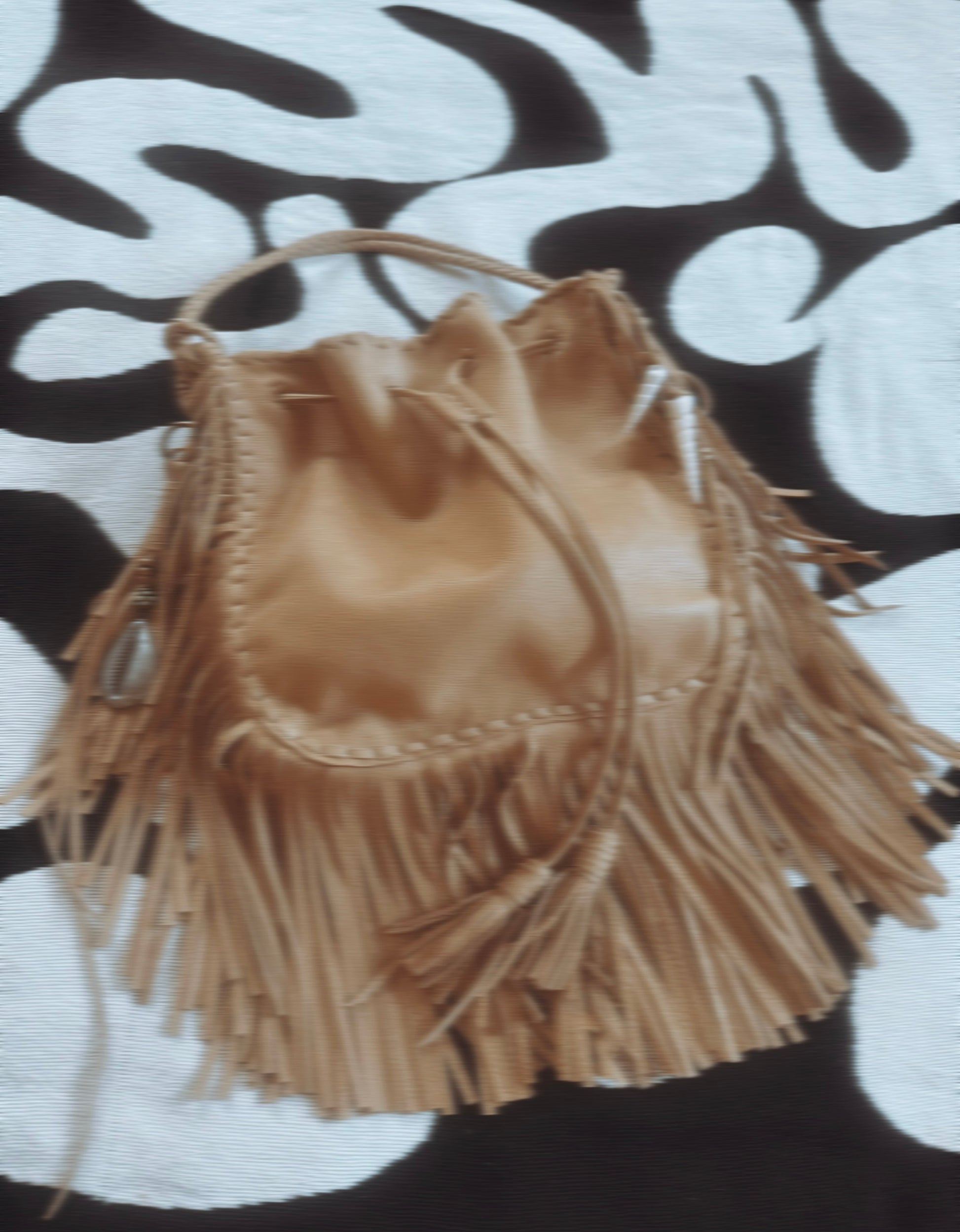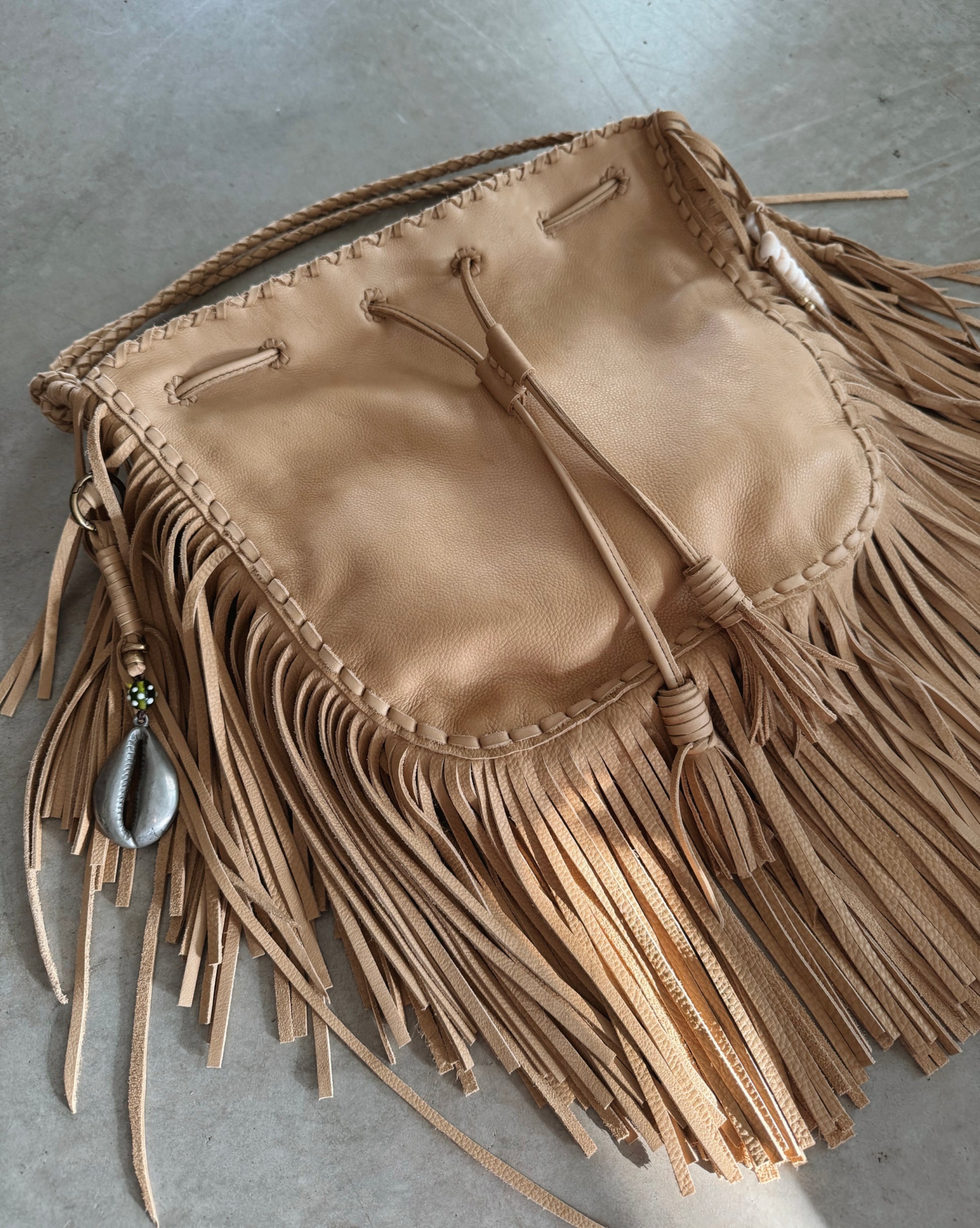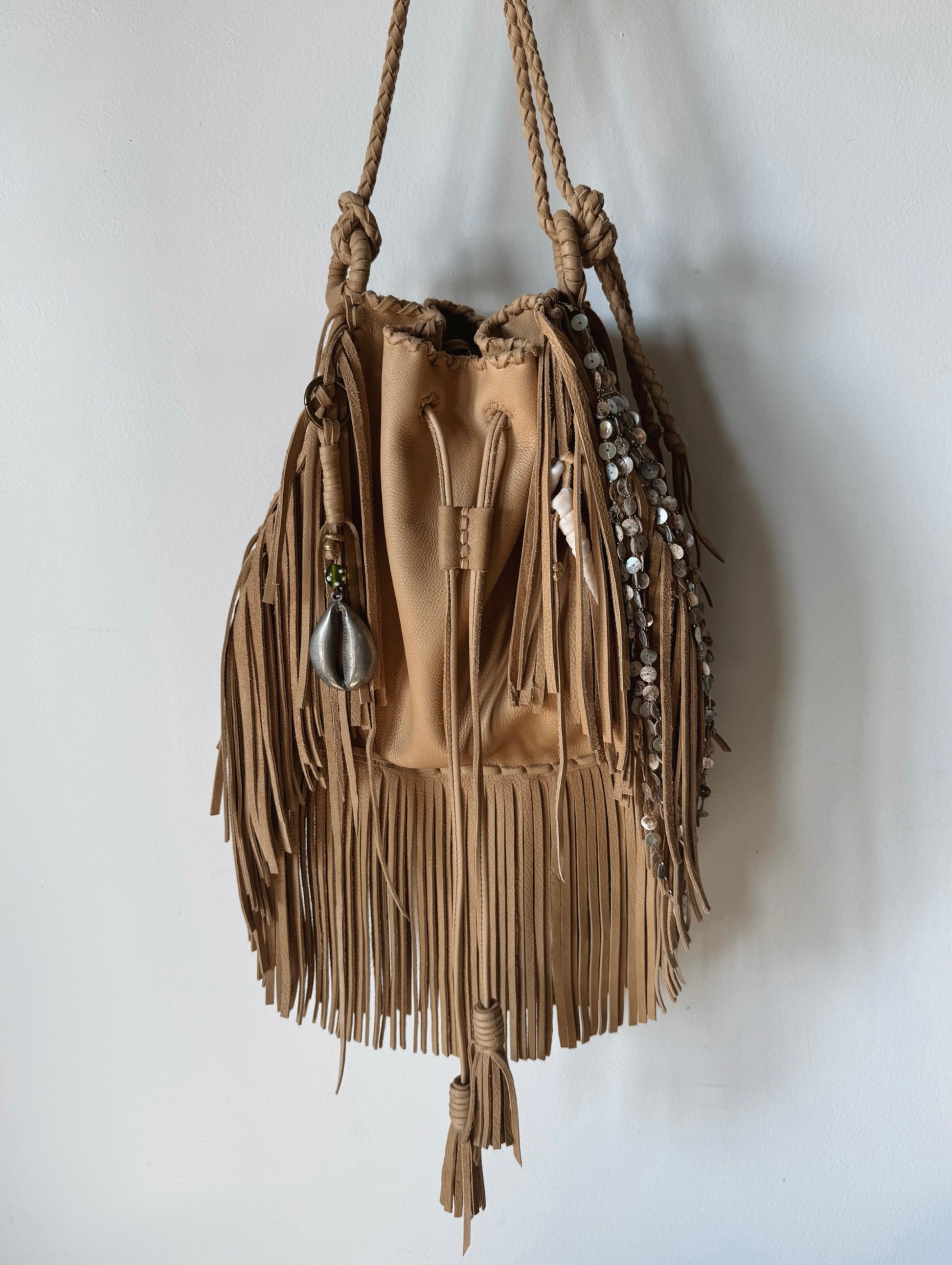 This bag is big!! It’s a tote actually! Lots of room! All hand laced and double the fringe. The bag is laced front to back and laced gusset. The fringe flows from top to bottom, along the entire shape of the bag, front and back. Two pockets on the inside and a drawstring closure outside. Carried by a round braided strap. It’s a short shoulder strap but can be lengthened! Leather wrapped rings, which are sewn then laced to the bag. Fully laced edging along the top of the bag. A full 3” gusset, where a lot of the room comes from. The top of the bag is wider than the bottom to give it a cool shape when worn open or closed.