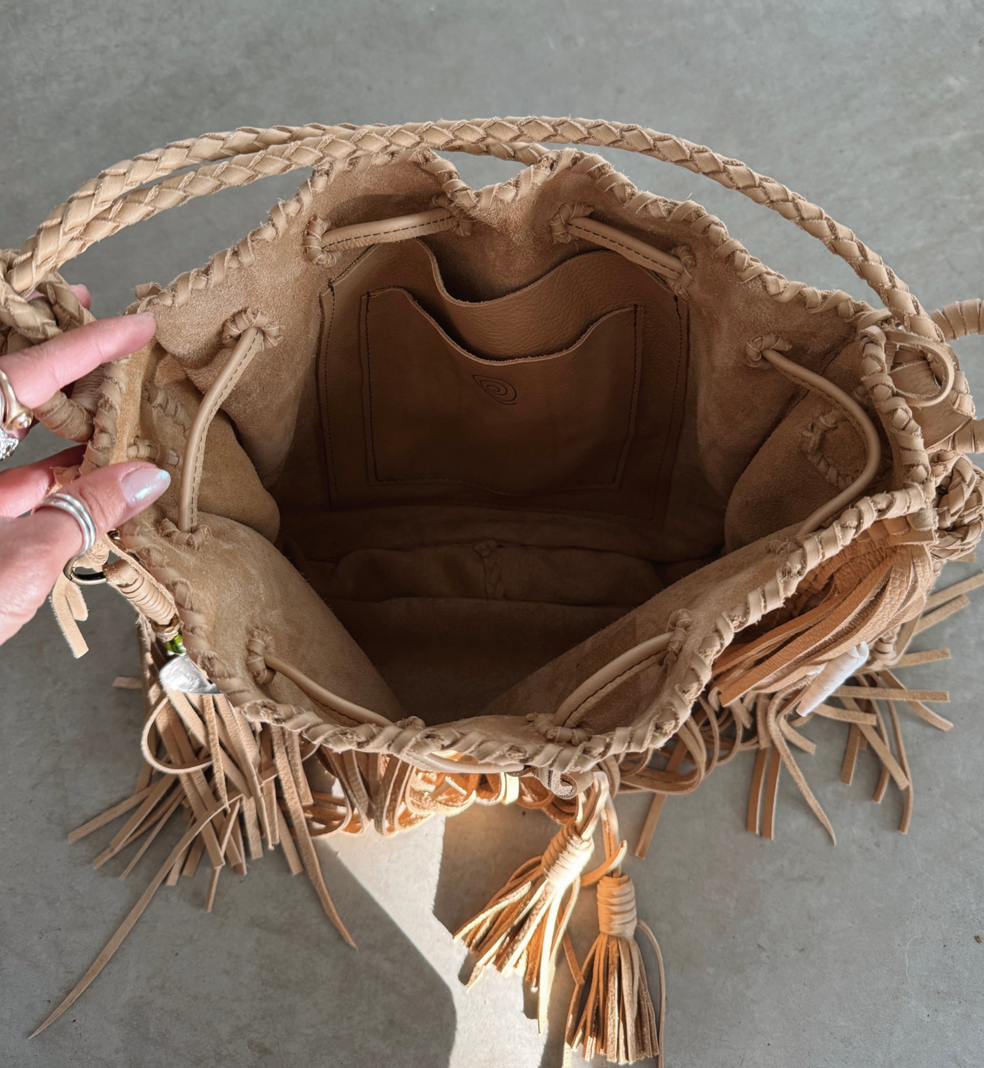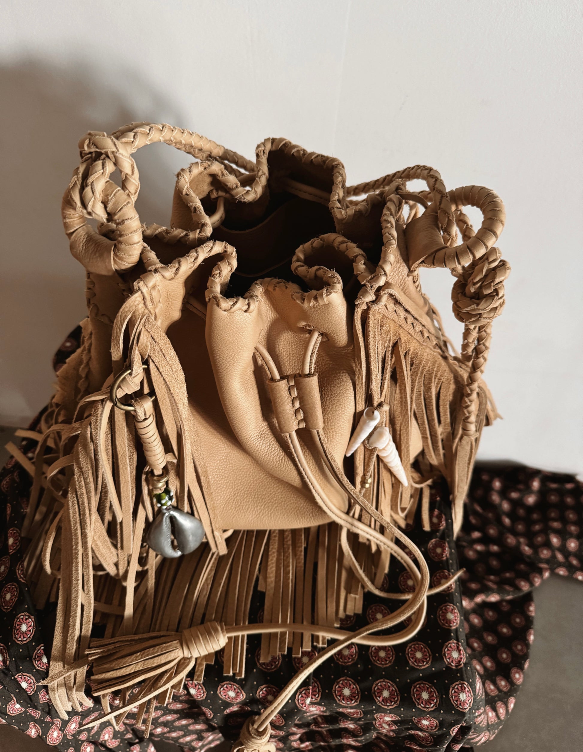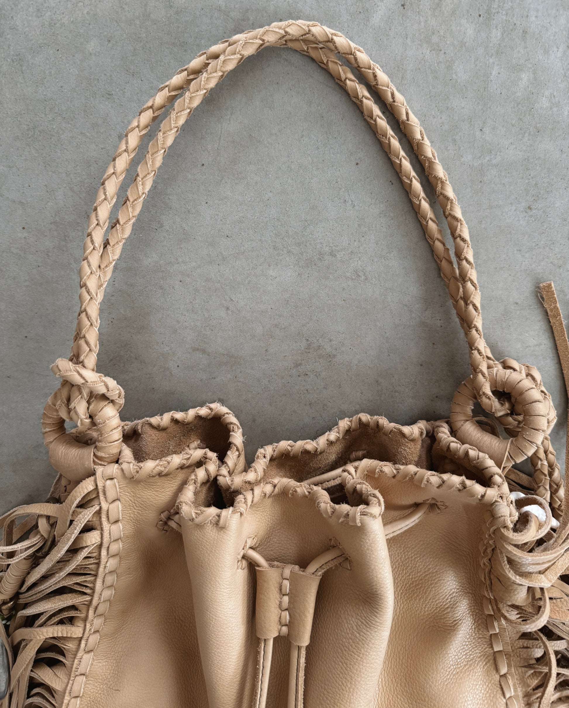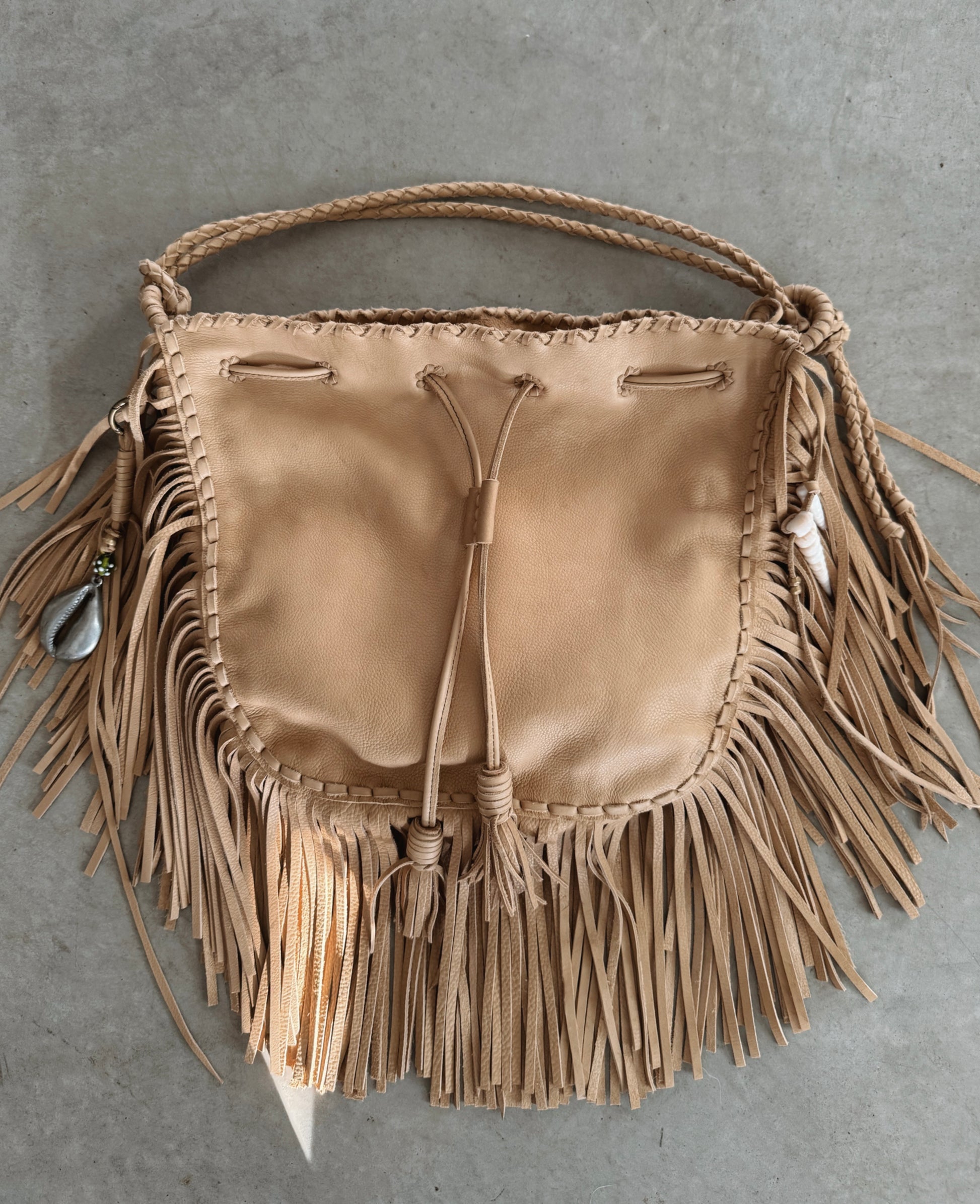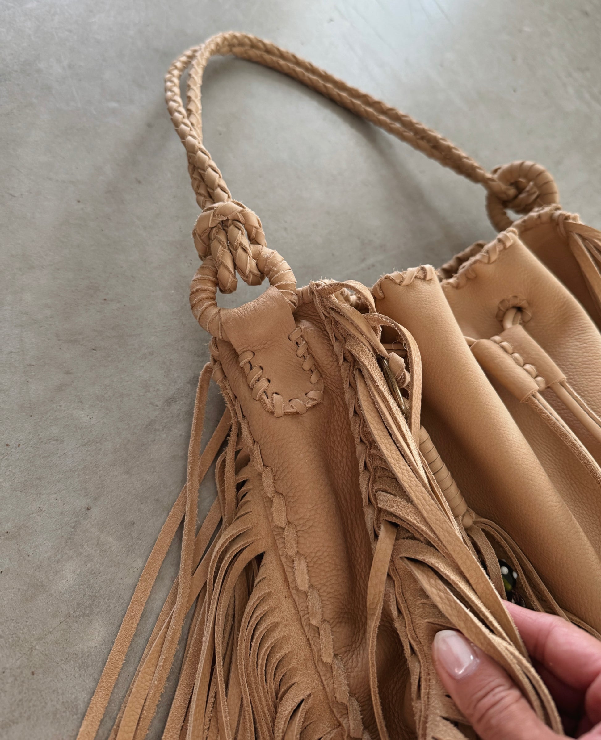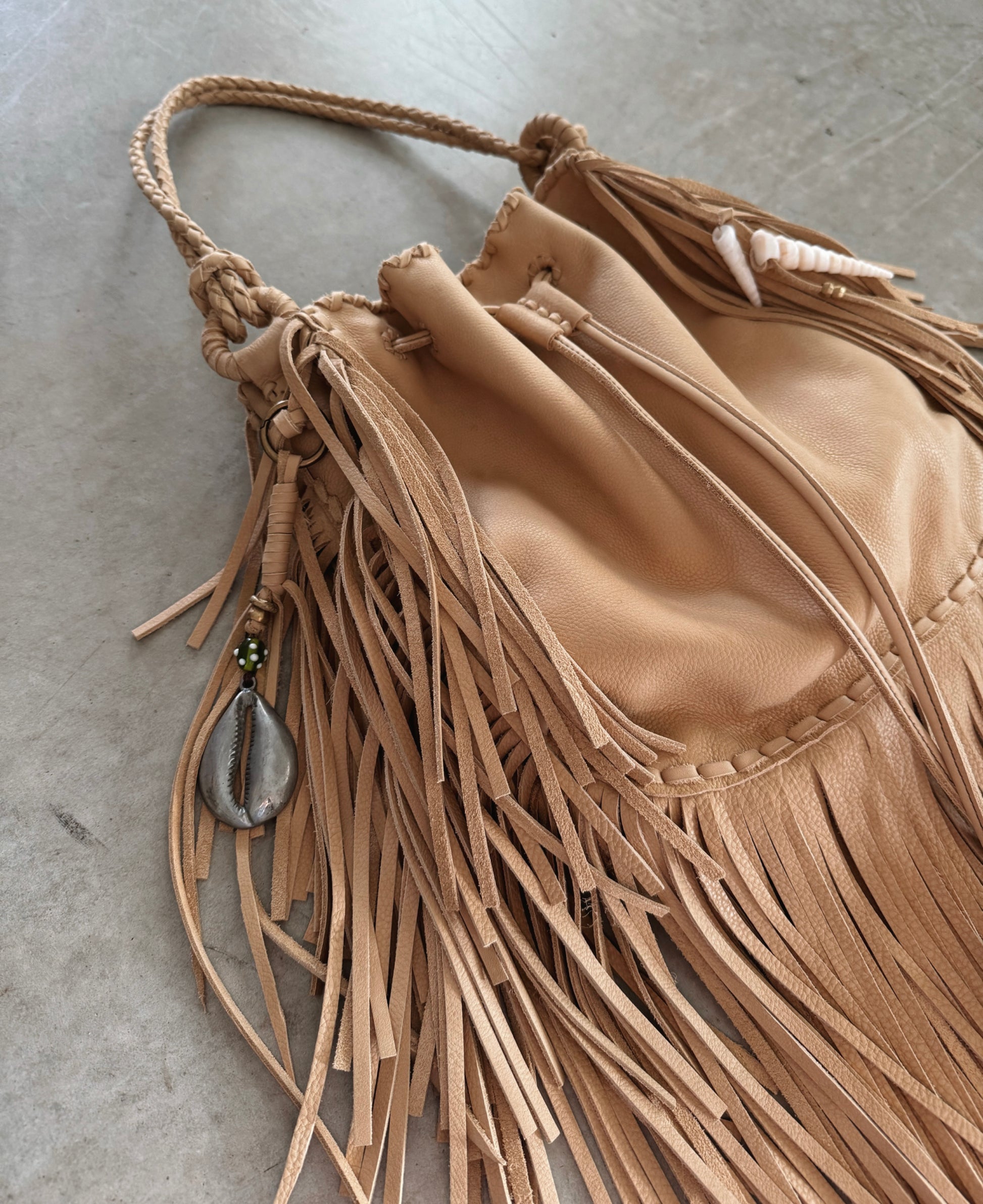 This bag is big!! It’s a tote actually! Lots of room! All hand laced and double the fringe. The bag is laced front to back and laced gusset. The fringe flows from top to bottom, along the entire shape of the bag, front and back. Two pockets on the inside and a drawstring closure outside. Carried by a round braided strap. It’s a short shoulder strap but can be lengthened! Leather wrapped rings, which are sewn then laced to the bag. Fully laced edging along the top of the bag. A full 3” gusset, where a lot of the room comes from. The top of the bag is wider than the bottom to give it a cool shape when worn open or closed.