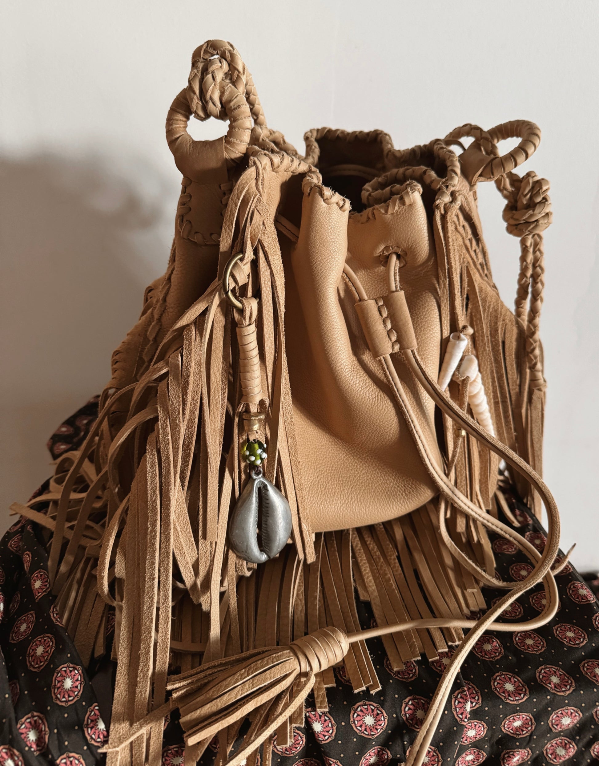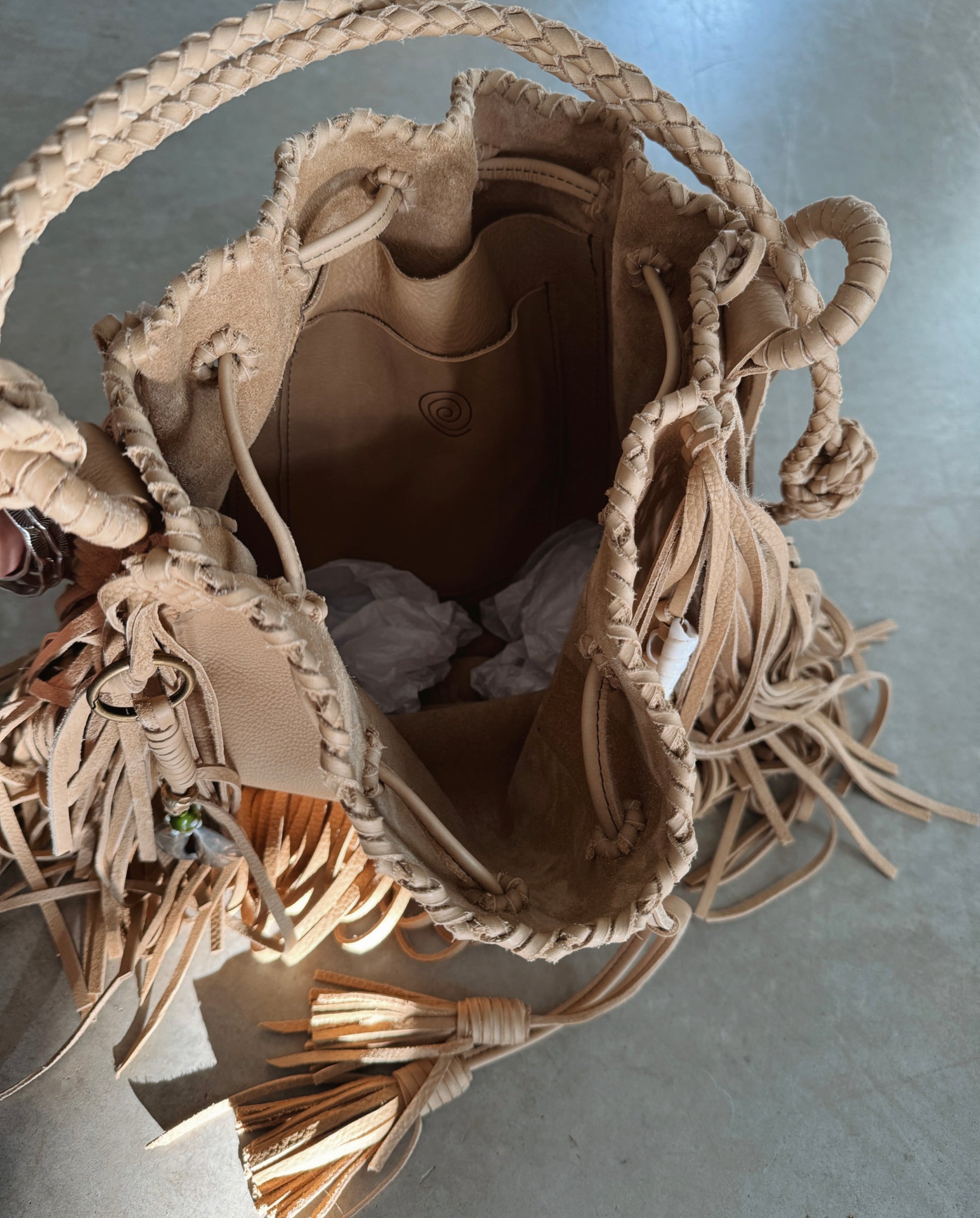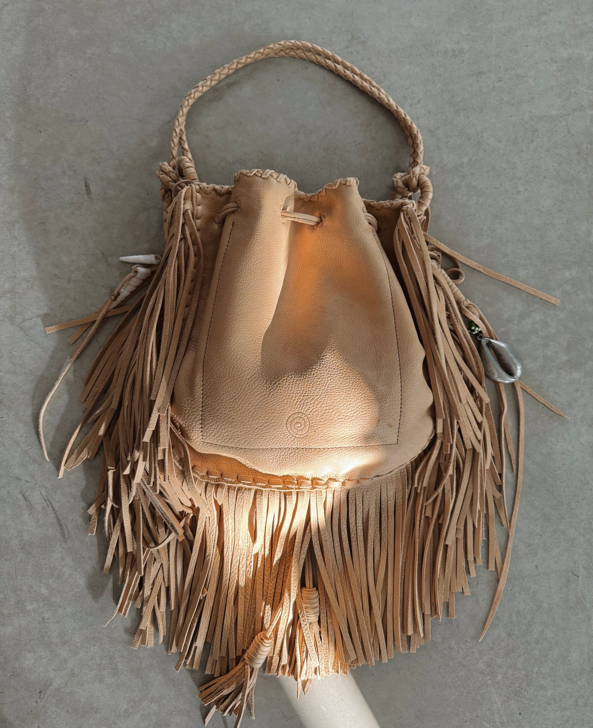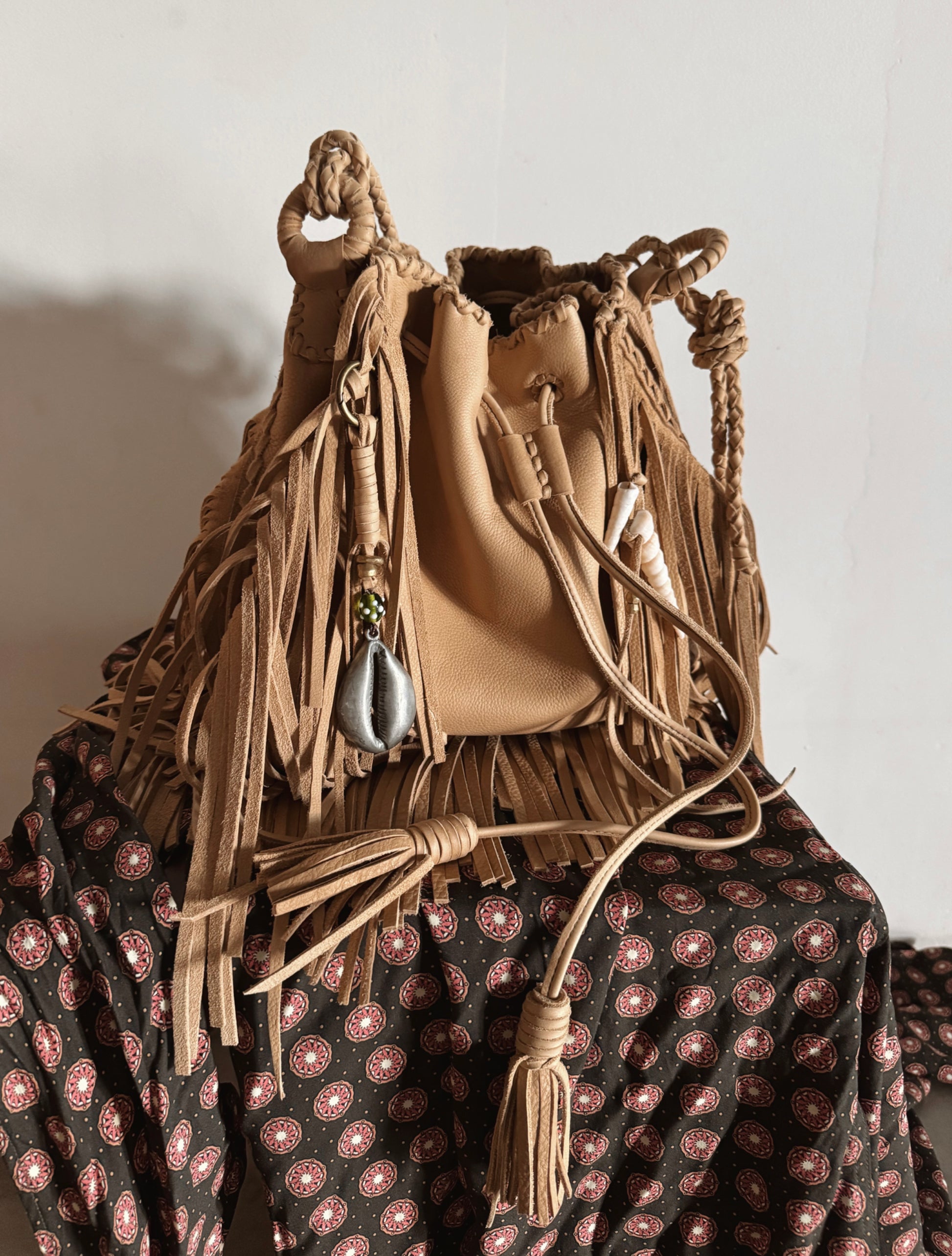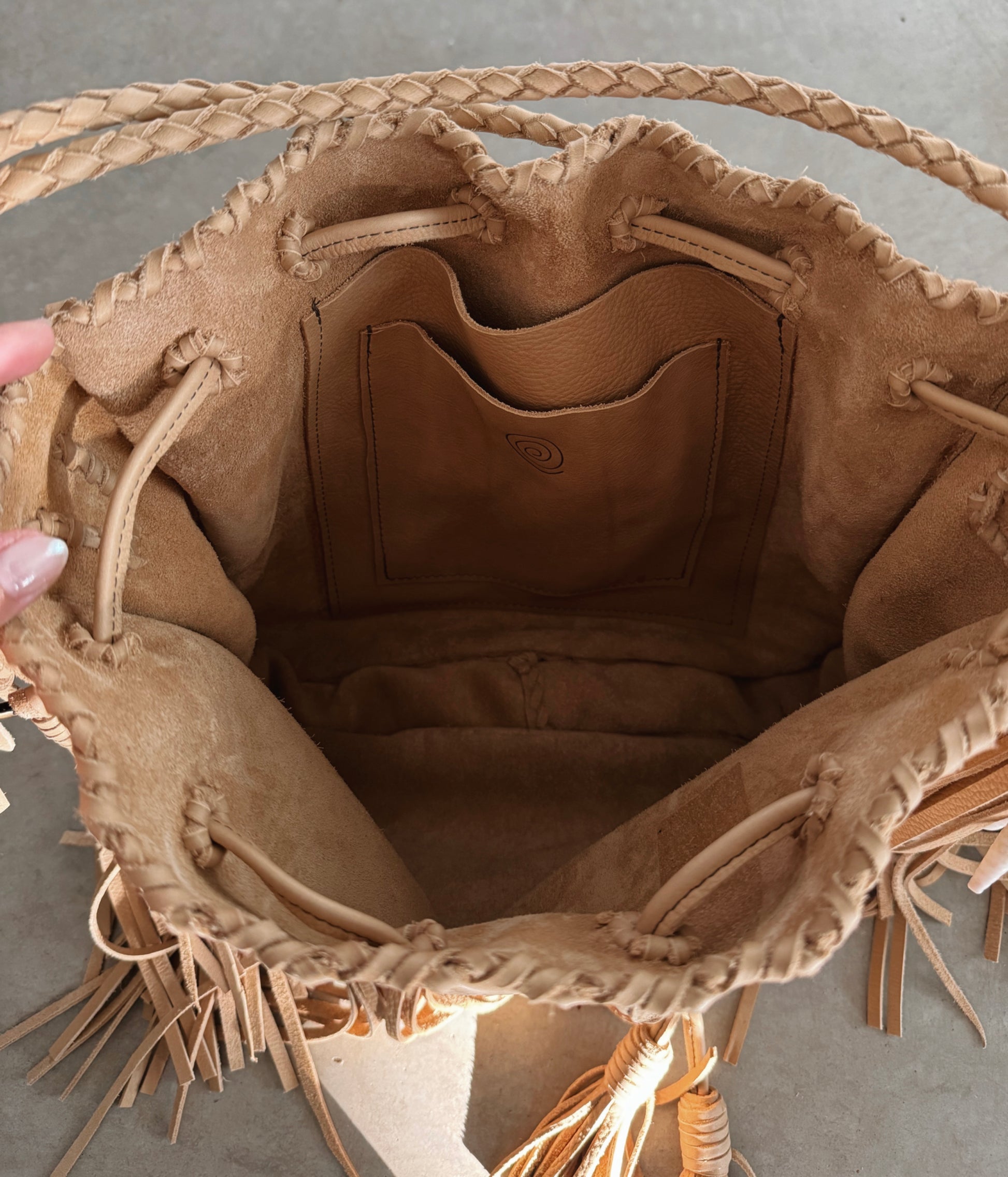 This bag is big!! It’s a tote actually! Lots of room! All hand laced and double the fringe. The bag is laced front to back and laced gusset. The fringe flows from top to bottom, along the entire shape of the bag, front and back. Two pockets on the inside and a drawstring closure outside. Carried by a round braided strap. It’s a short shoulder strap but can be lengthened! Leather wrapped rings, which are sewn then laced to the bag. Fully laced edging along the top of the bag. A full 3” gusset, where a lot of the room comes from. The top of the bag is wider than the bottom to give it a cool shape when worn open or closed.