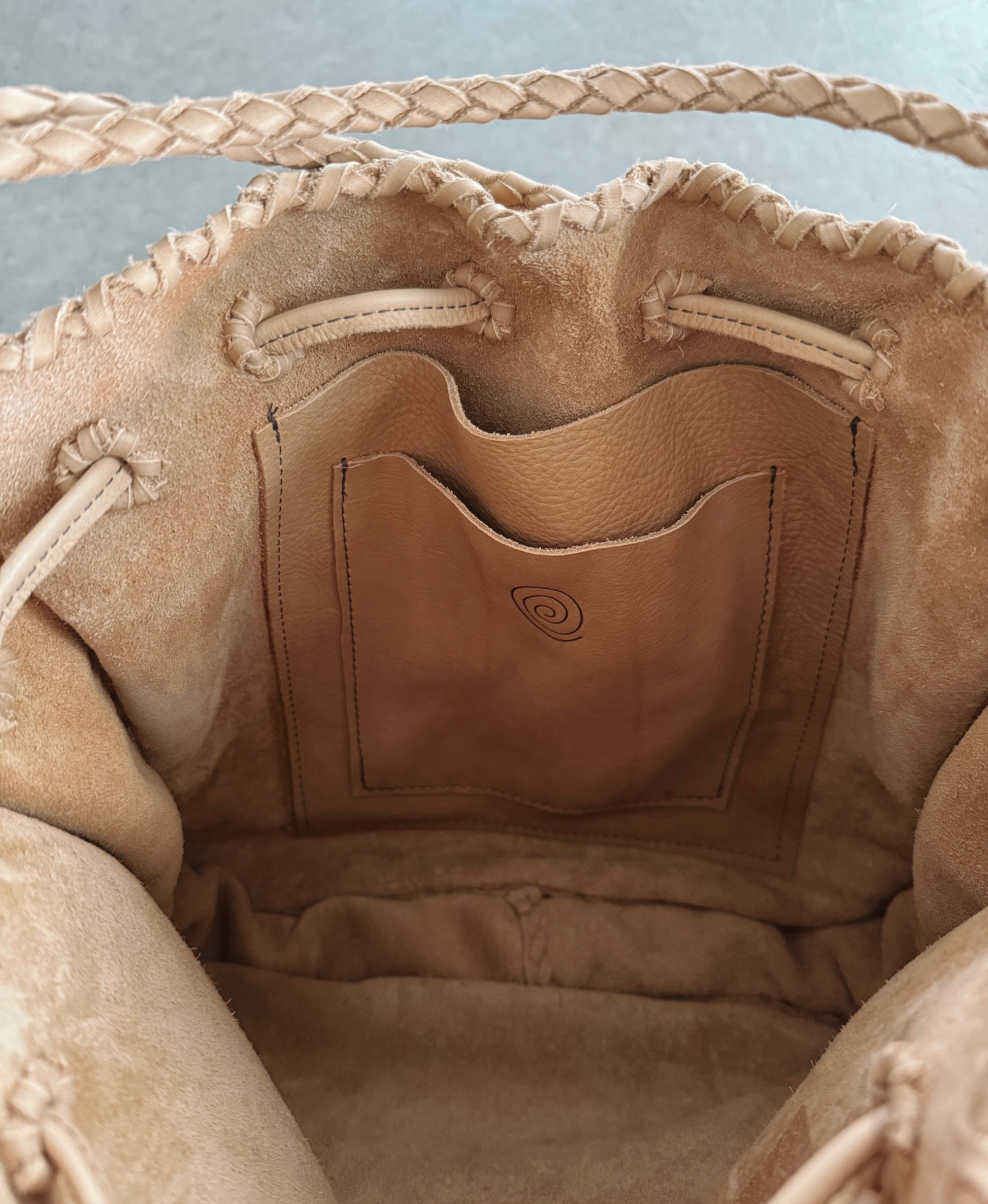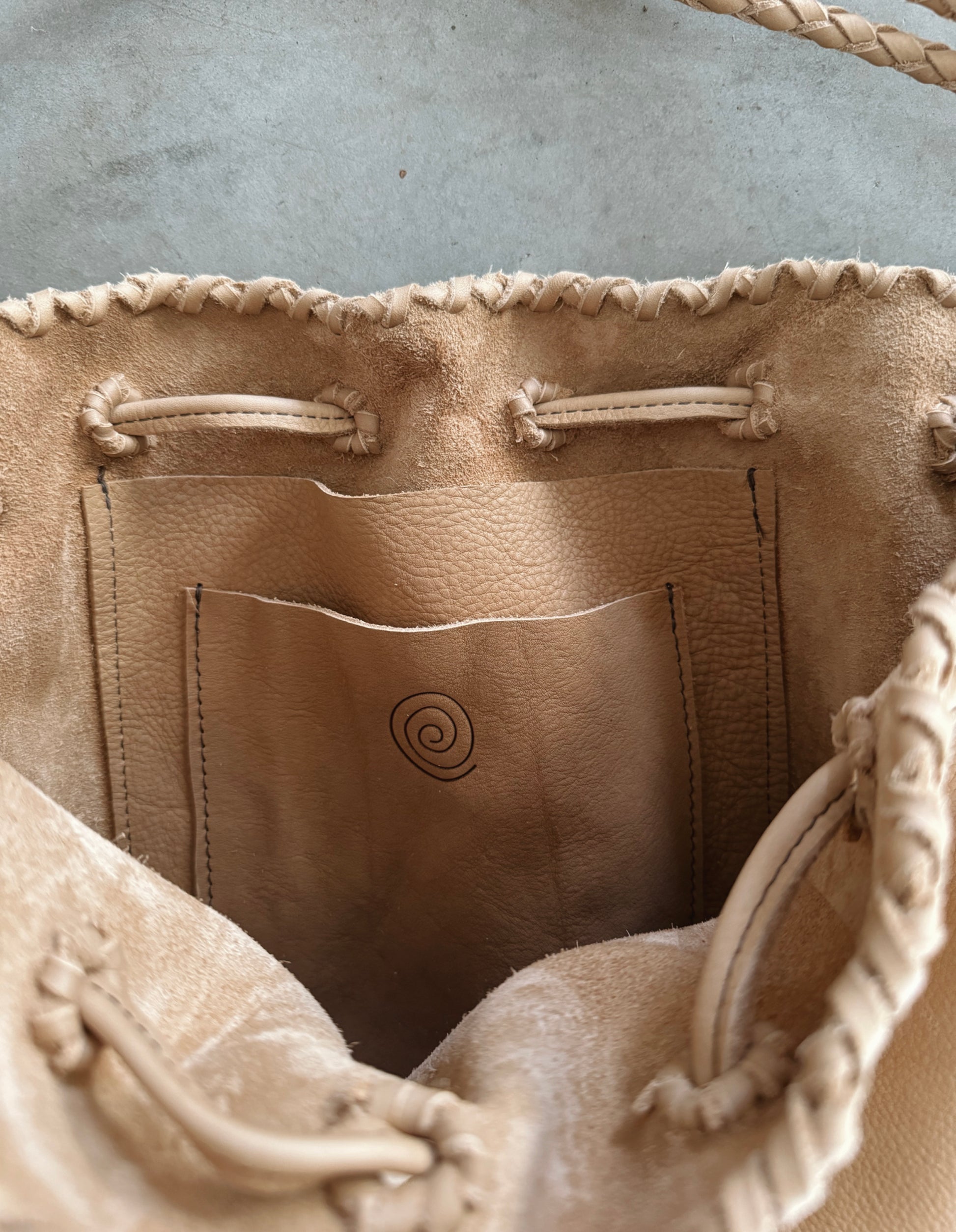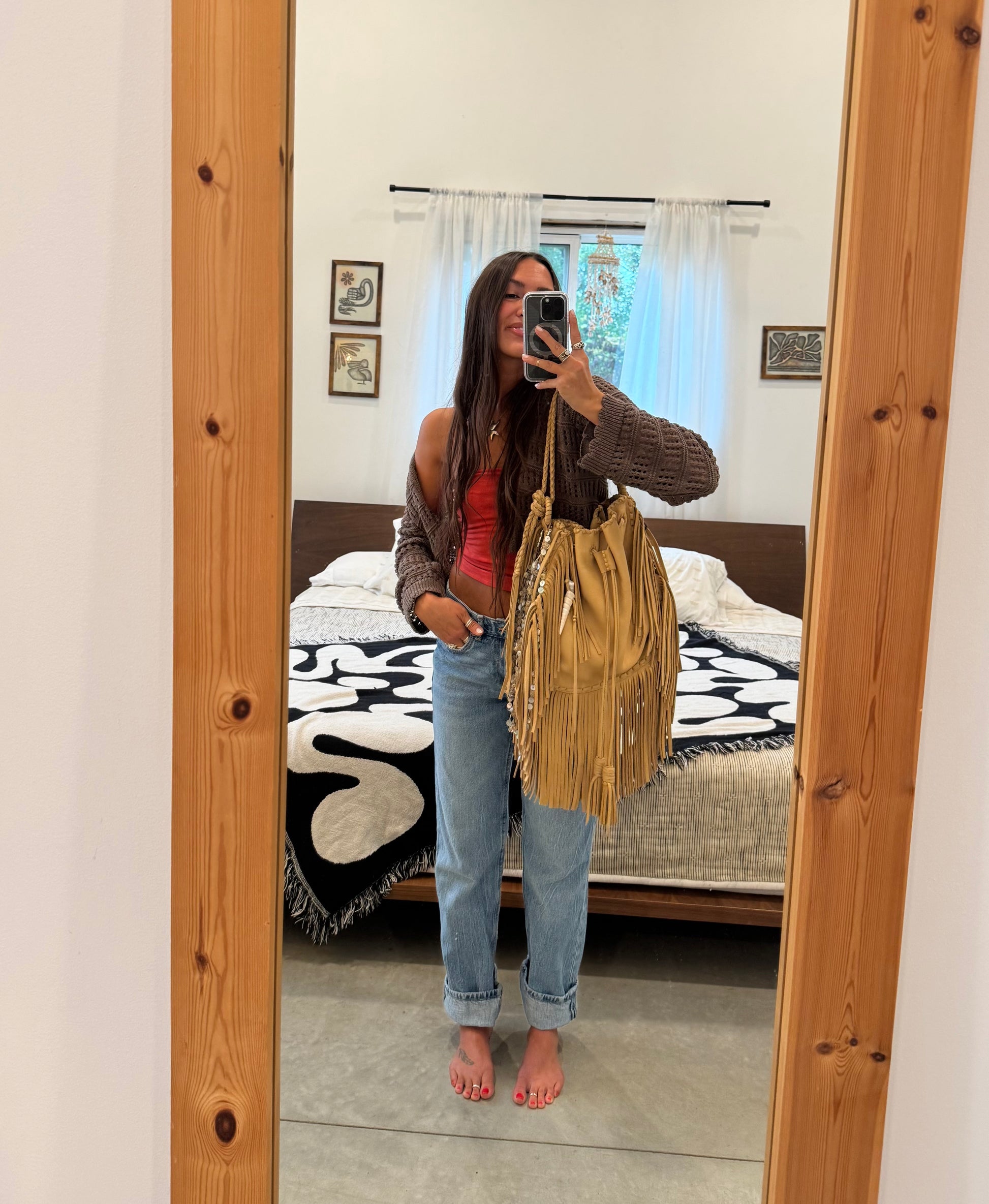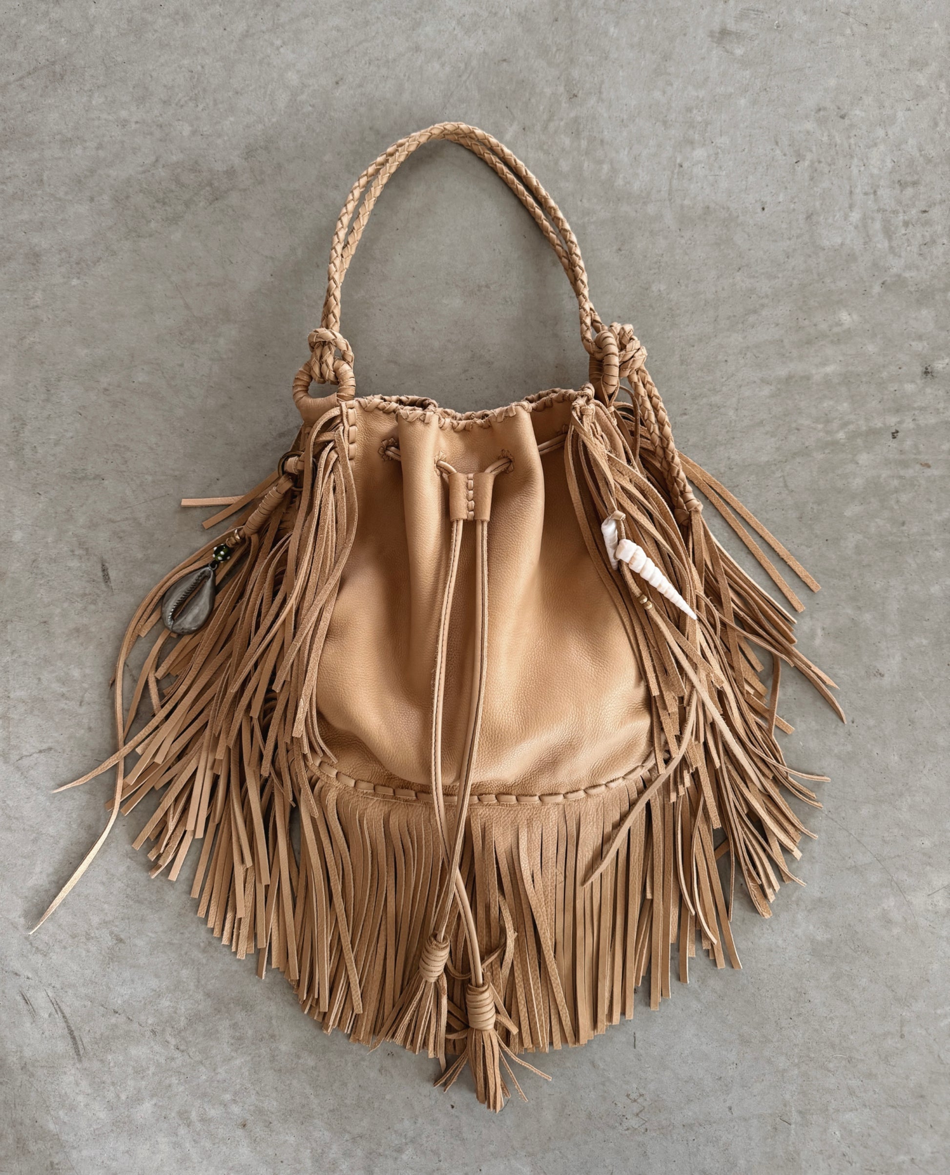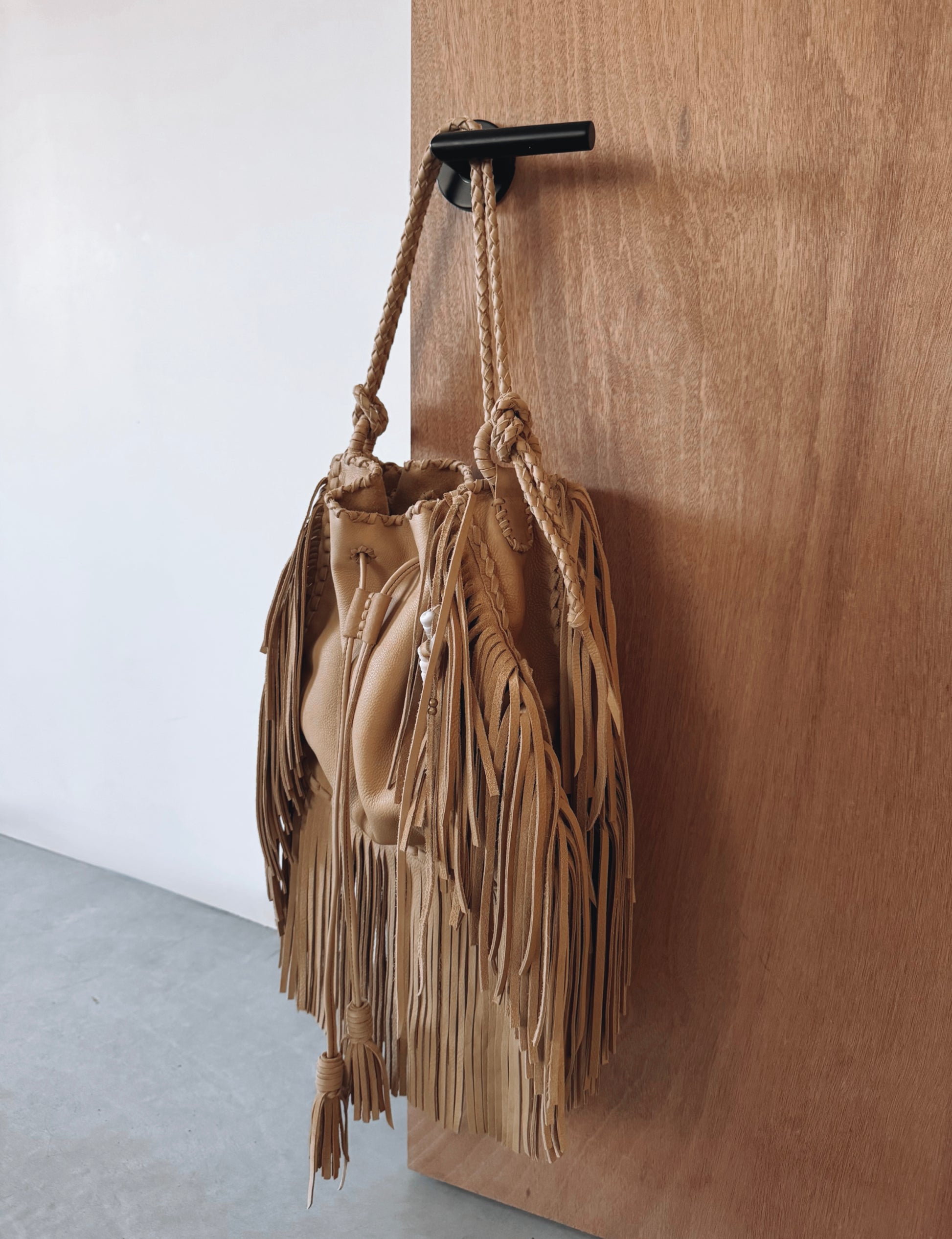 This bag is big!! It’s a tote actually! Lots of room! All hand laced and double the fringe. The bag is laced front to back and laced gusset. The fringe flows from top to bottom, along the entire shape of the bag, front and back. Two pockets on the inside and a drawstring closure outside. Carried by a round braided strap. It’s a short shoulder strap but can be lengthened! Leather wrapped rings, which are sewn then laced to the bag. Fully laced edging along the top of the bag. A full 3” gusset, where a lot of the room comes from. The top of the bag is wider than the bottom to give it a cool shape when worn open or closed.