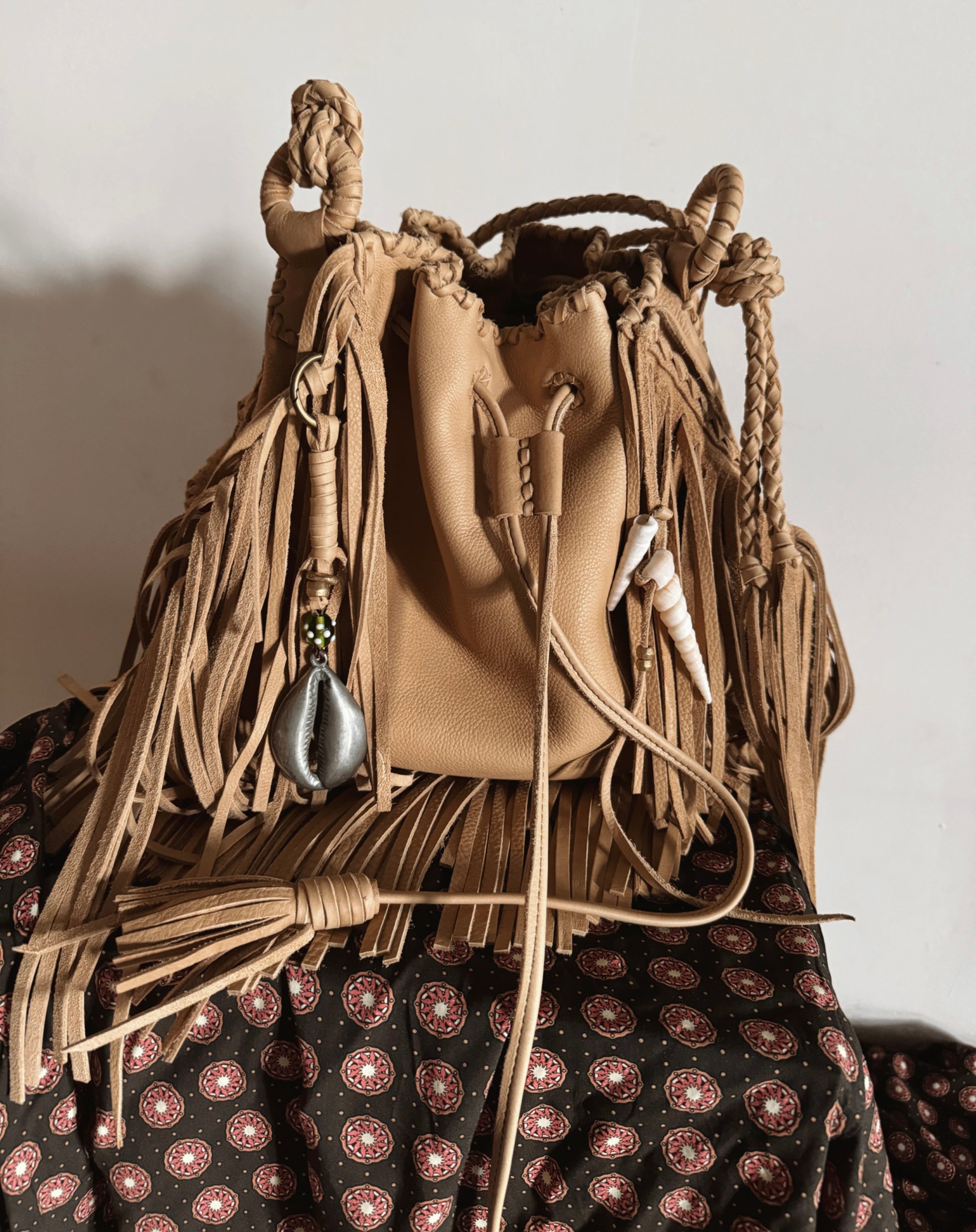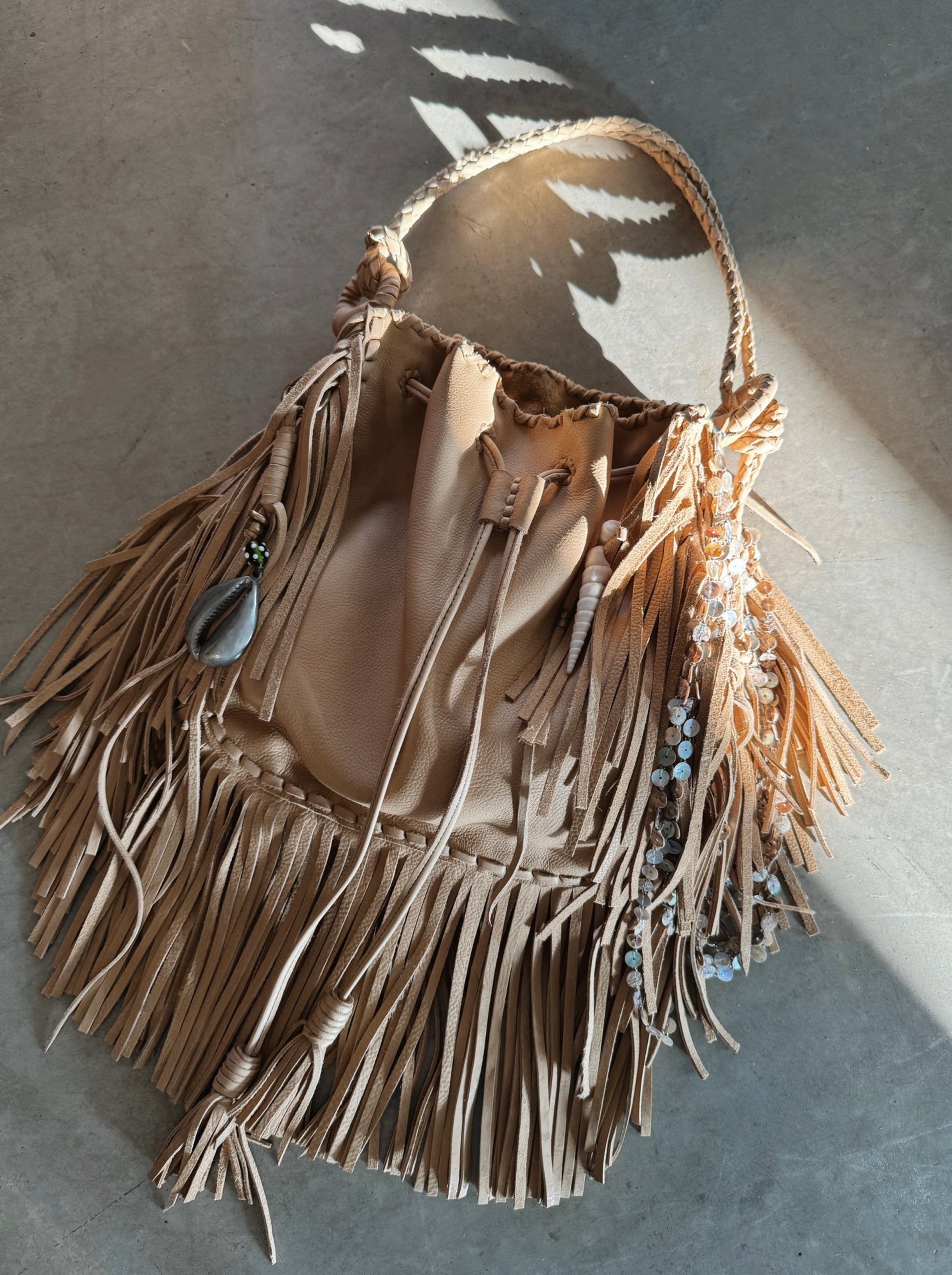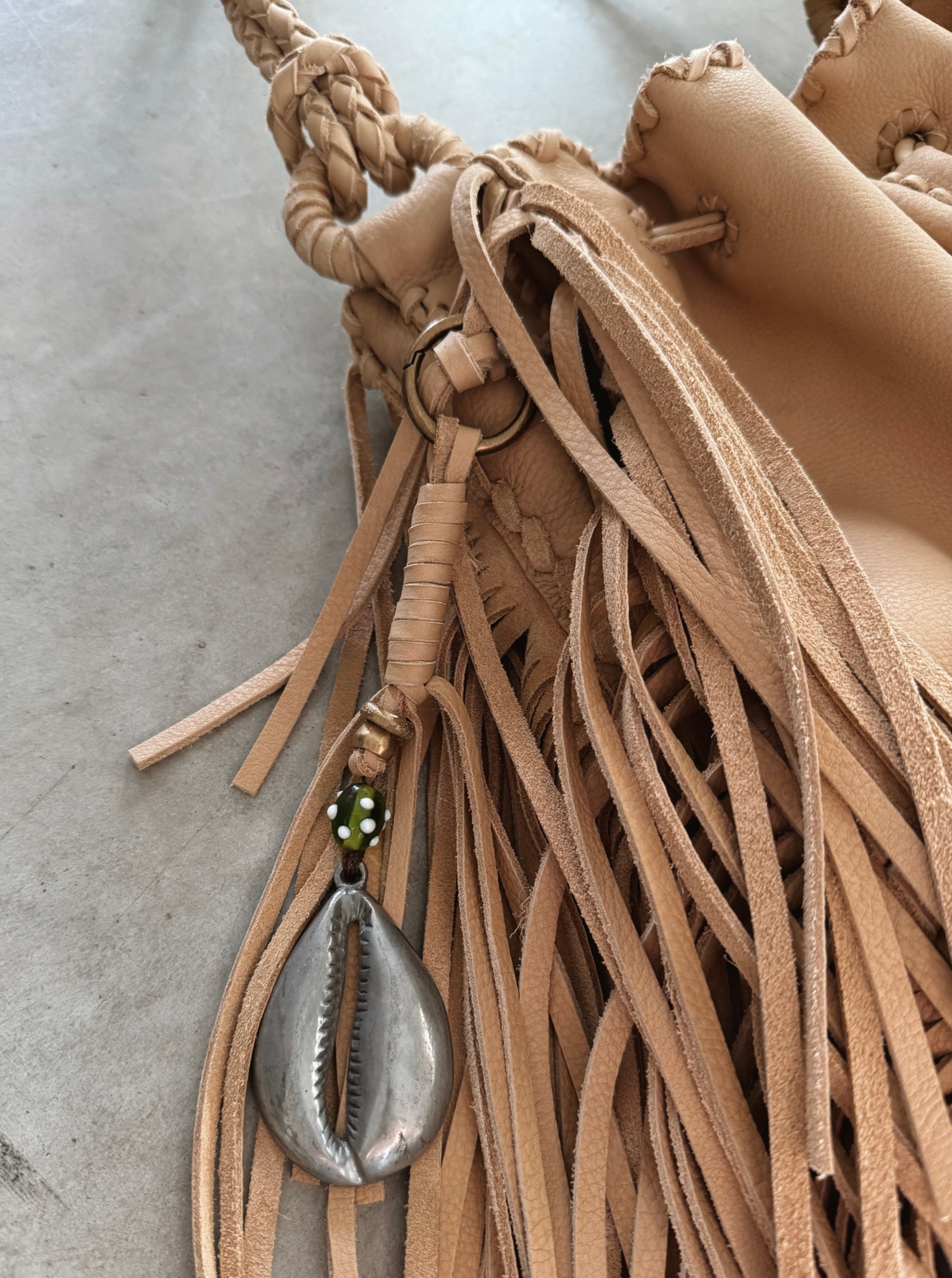 You will receive the bag itself along with the large silver cowrie bag charm! The only things that will be different is the bead on the silver bag charm (will not be that green bead) I will use other pretty beads I come across. Shells will vary slightly! Dainty abalone shell disks strung together and draped into the fringe will come on the bag as well! Colors vary slightly.
