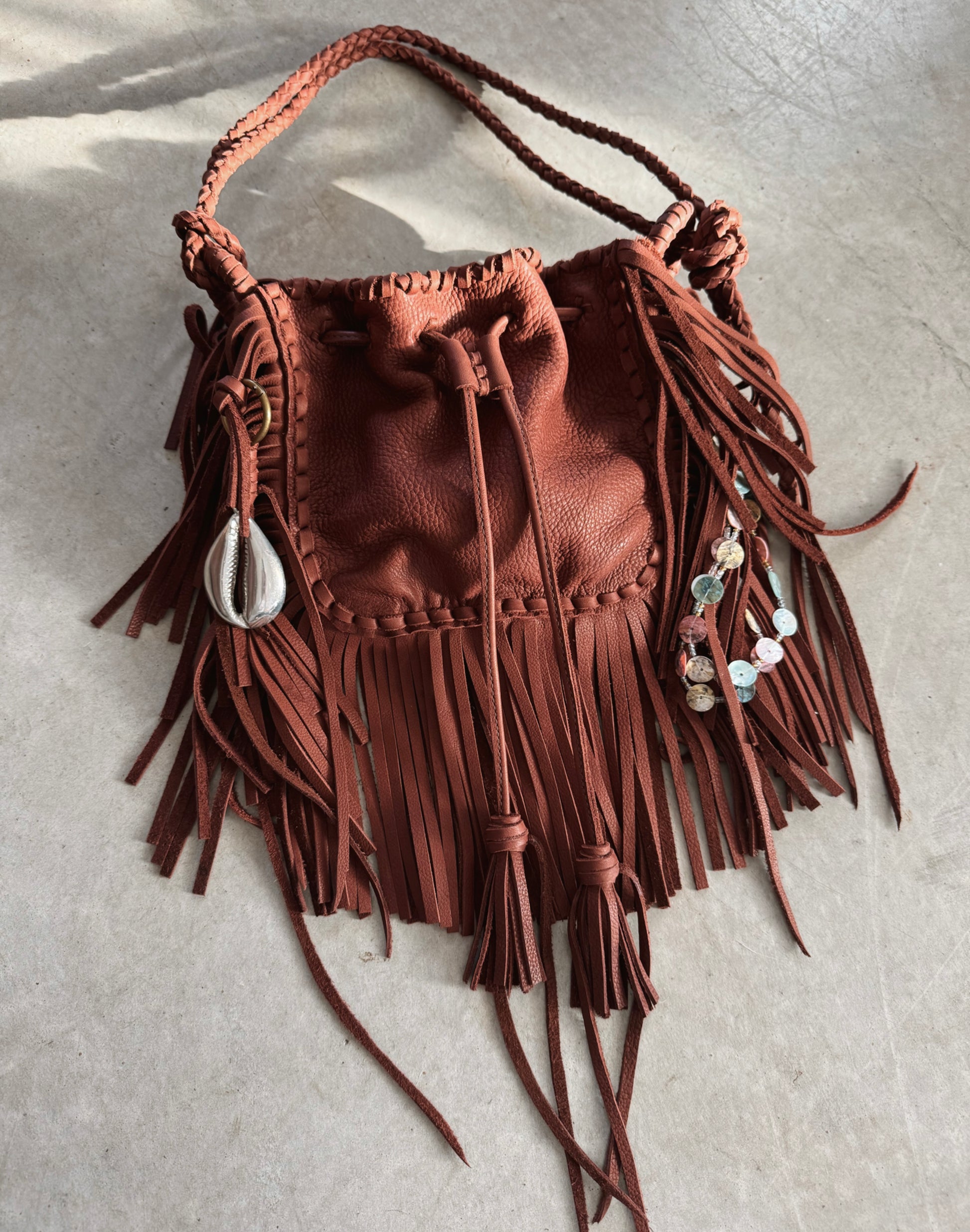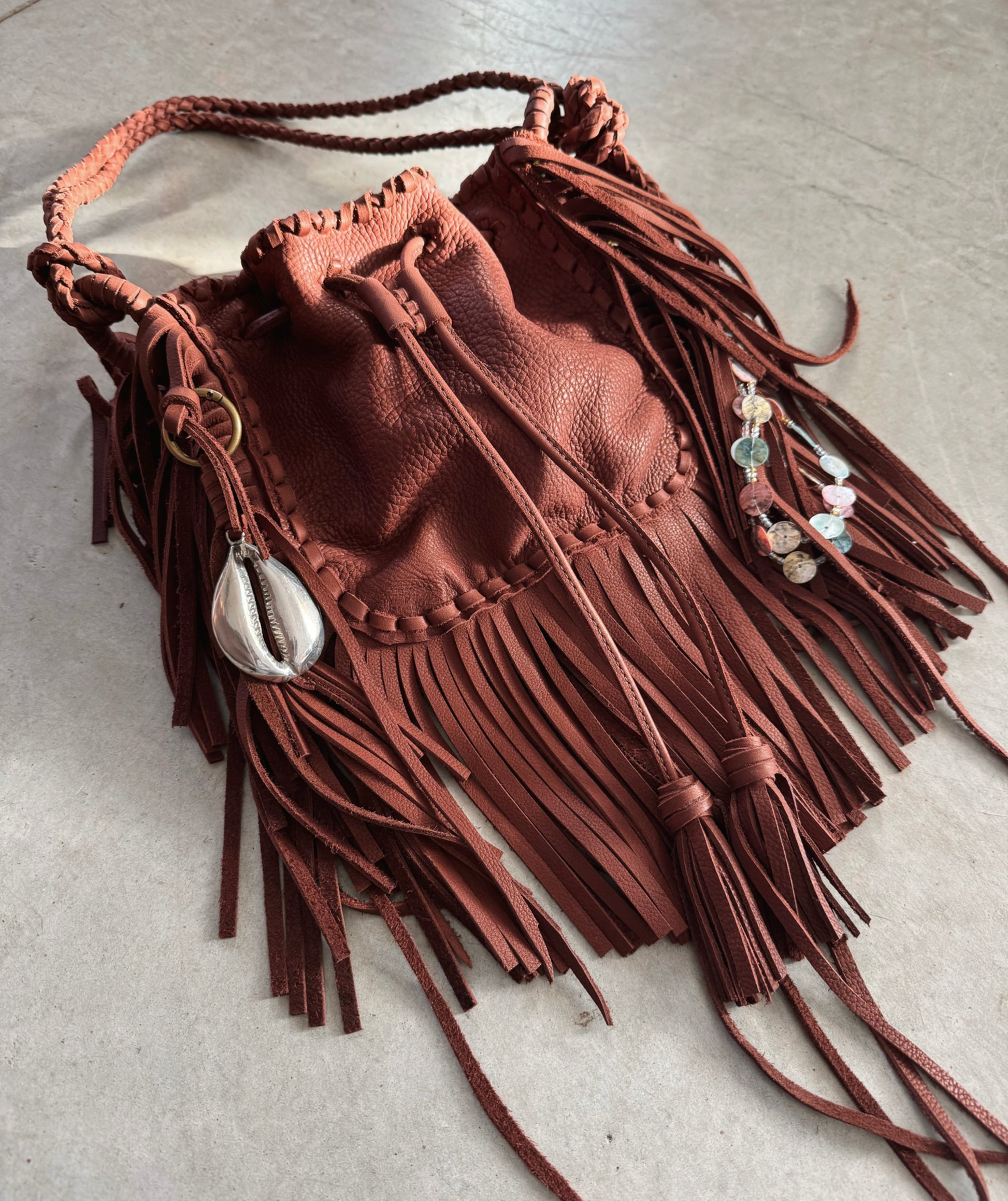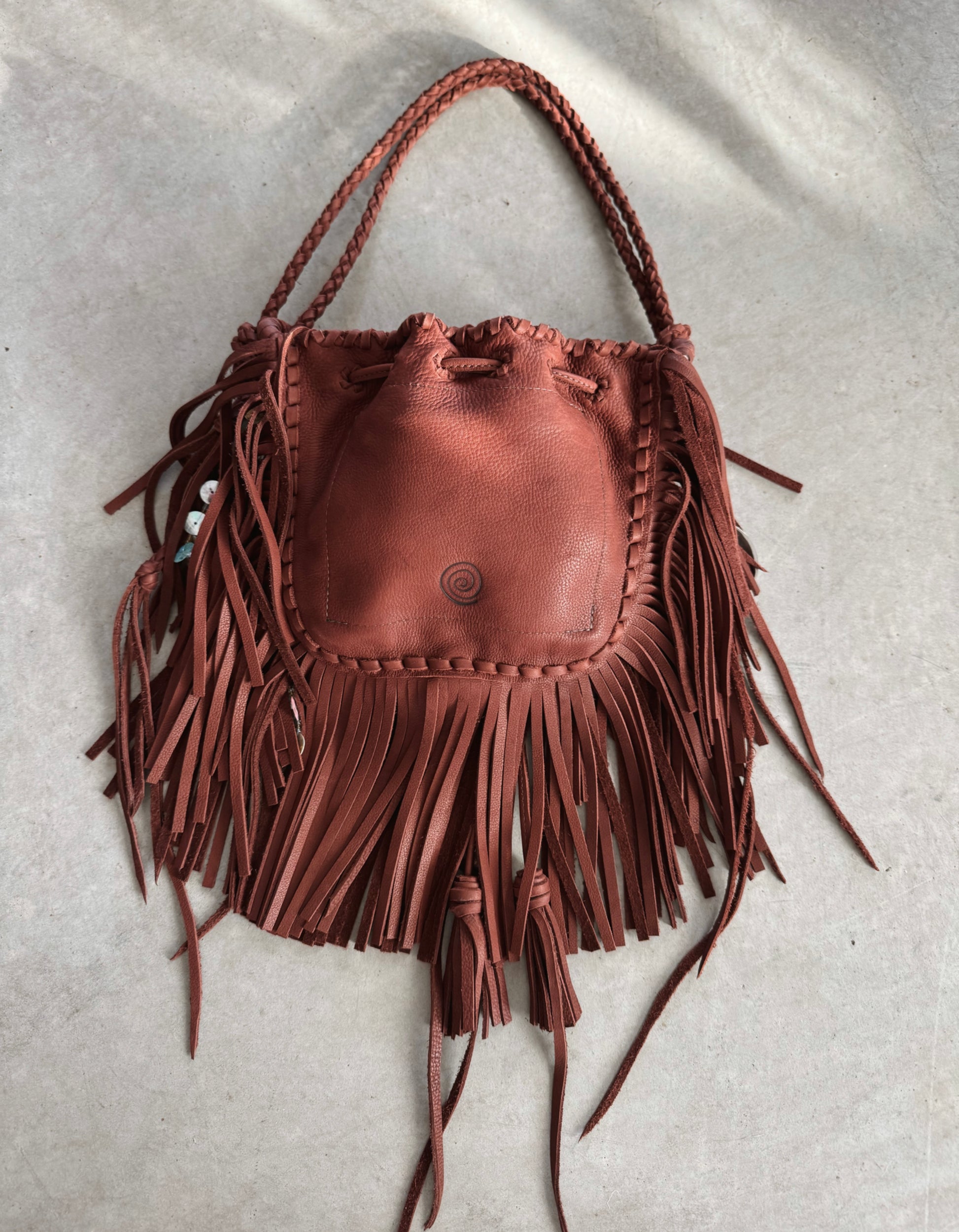 The exact mini version of The Bondi tote bag. All hand laced and double the fringe. The bag is laced front to back and laced gusset. The fringe flows from top to bottom, along the entire shape of the bag, front and back. One zipper pocket on the inside and a drawstring closure outside. Carried by a round braided strap. It’s a short shoulder strap but can be lengthened! Leather wrapped rings, which are riveted then laced to the bag. Fully laced edging along the top of the bag. A full 2” gusset, where a lot of the room comes from. The top of the bag is wider than the bottom to give it a cool shape when worn open or closed.