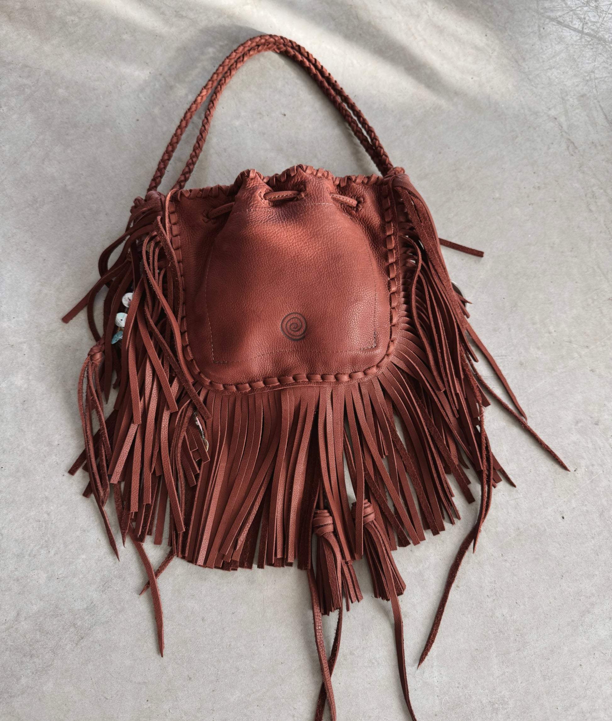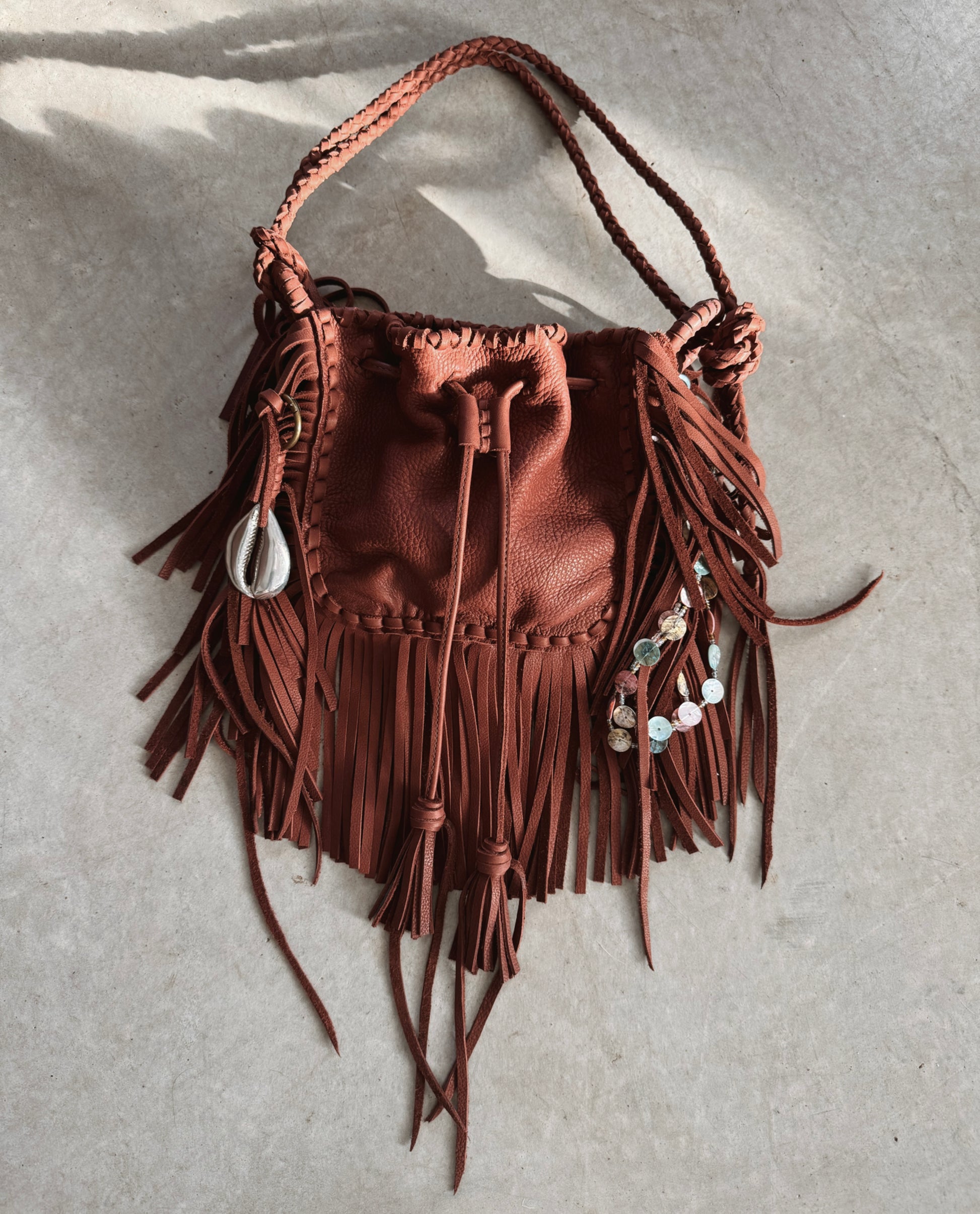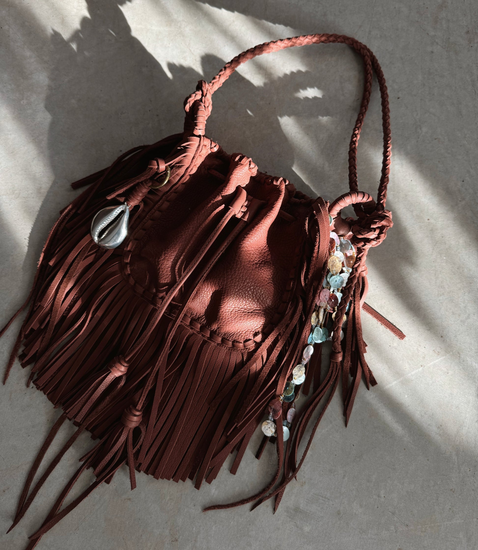 The exact mini version of The Bondi tote bag. All hand laced and double the fringe. The bag is laced front to back and laced gusset. The fringe flows from top to bottom, along the entire shape of the bag, front and back. One zipper pocket on the inside and a drawstring closure outside. Carried by a round braided strap. It’s a short shoulder strap but can be lengthened! Leather wrapped rings, which are riveted then laced to the bag. Fully laced edging along the top of the bag. A full 2” gusset, where a lot of the room comes from. The top of the bag is wider than the bottom to give it a cool shape when worn open or closed.
