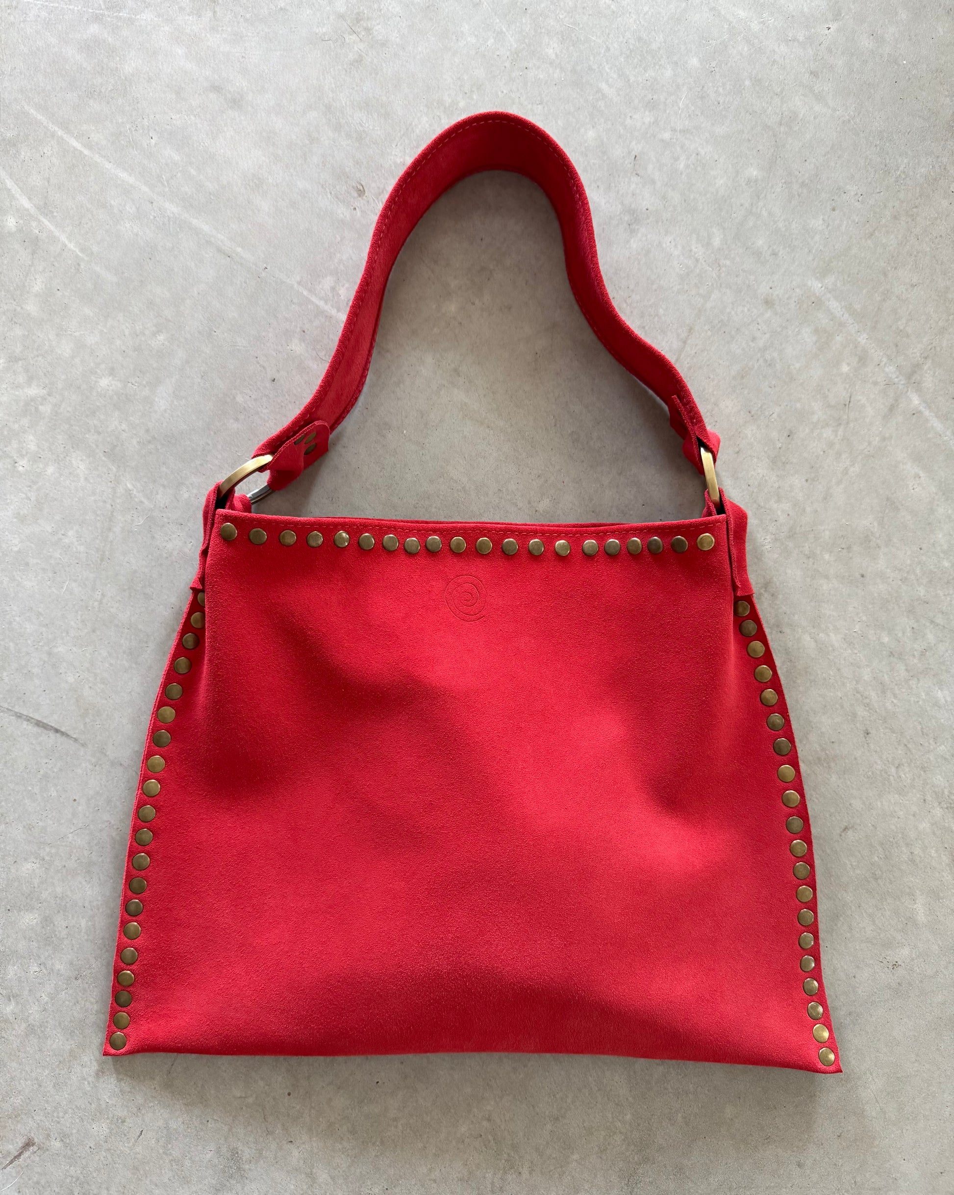 Funky and simple, this bag features antiqued brass rivets across the bag and down the sides. Has a short shoulder strap, hung with antiqued brass rings. A matching pouch pocket inside that is removable. The Brandi is fun and easy and ready to go! (kinda sorta similar to the Frankie, a rectangular triangular shape hobo shoulder bag.) This style bag would be cute with bag charms as well! Something I love about the Brandi bag, is she from the 70’s, the 90’s or today? She’s timeless! Made from quality genuine cowhide leather, she’ll last forever and age like fine wine!