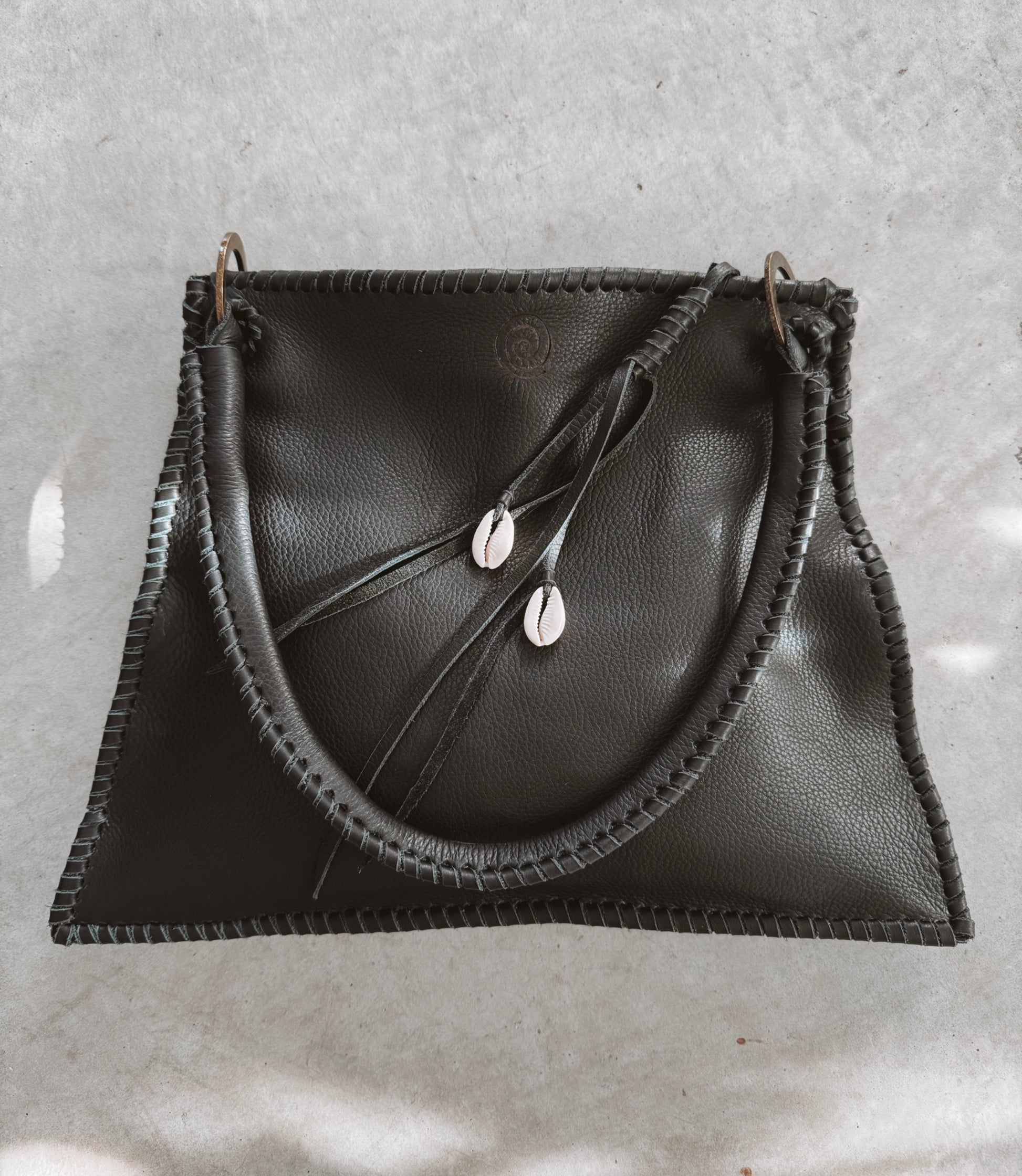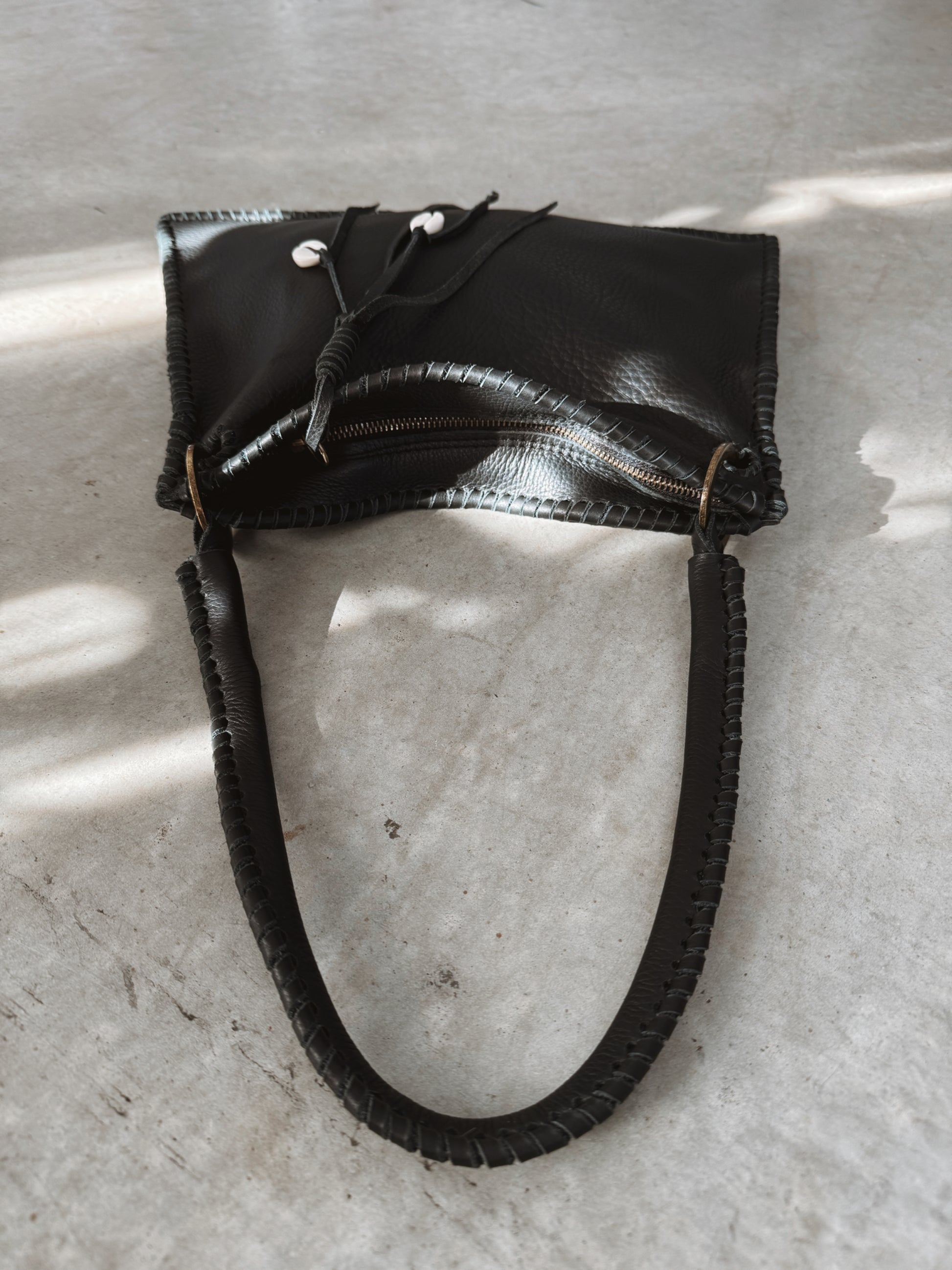 Frankie features a triangular rectangular style tote, in the softest buttery chocolate cowhide, she's so functional/fun! Completely laced from the shoulder to her base and all her edges. Accented with solid brass rings, a great zipper with a fringy tassel & a floating insert pouch.