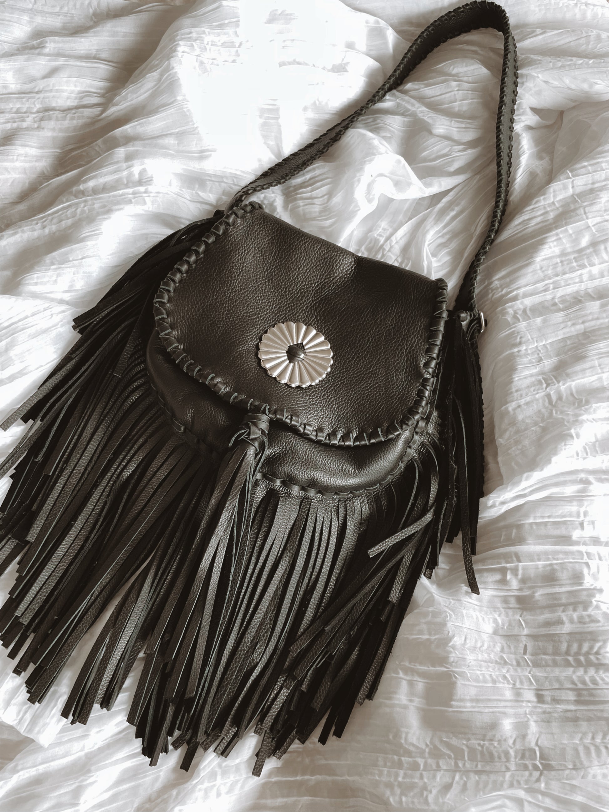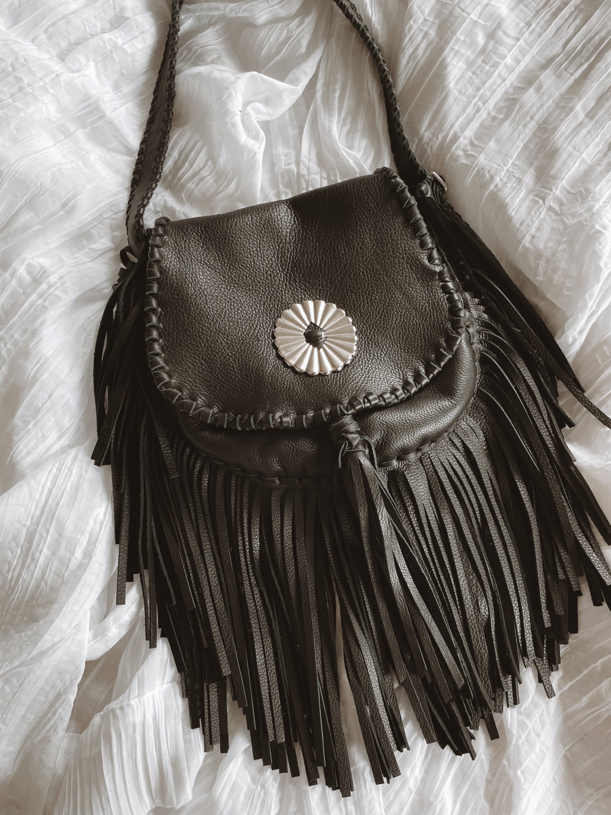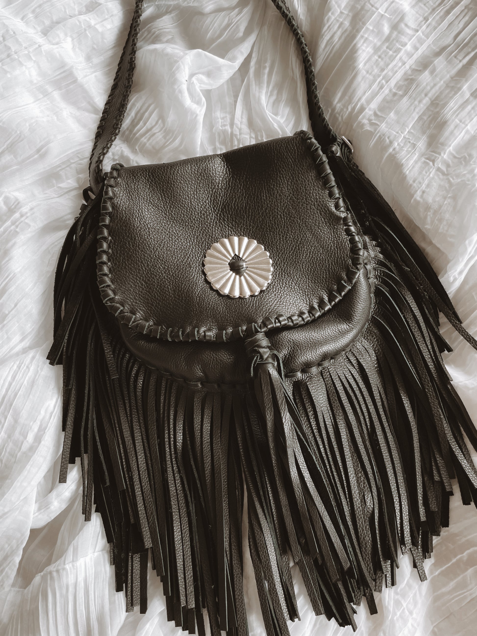 features two pockets, extra large front pocket and smaller inside pocket. a wide gusset for roomy room. a fixed shoulder strap (is not adjustable, it sits at a vintage length) and DOUBLE the fringe! ( fringe laced on both the front and the back!