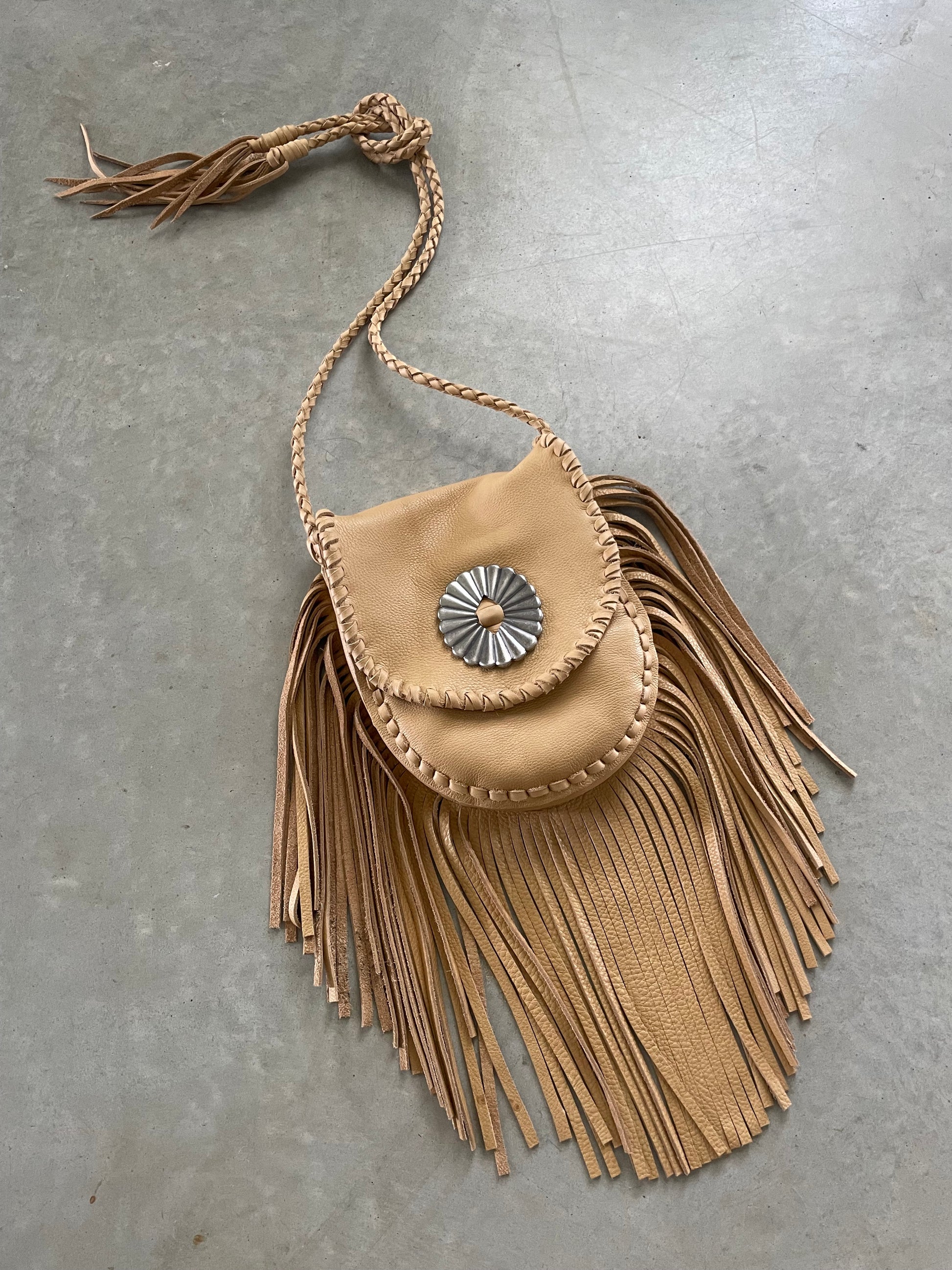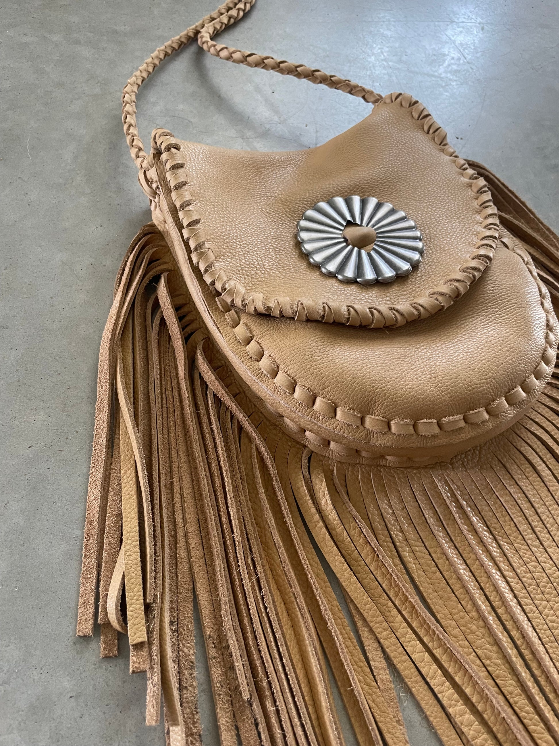 fully laced bag, features a front laced pocket and laced body, laced backside with full 9” fringe around the body. Laced edges and laced eyelets for the braided strap. Two 4 strand round braided straps that you can knot together however you like for your desired length! A fully laced flap with a beautiful large sunburst concho.