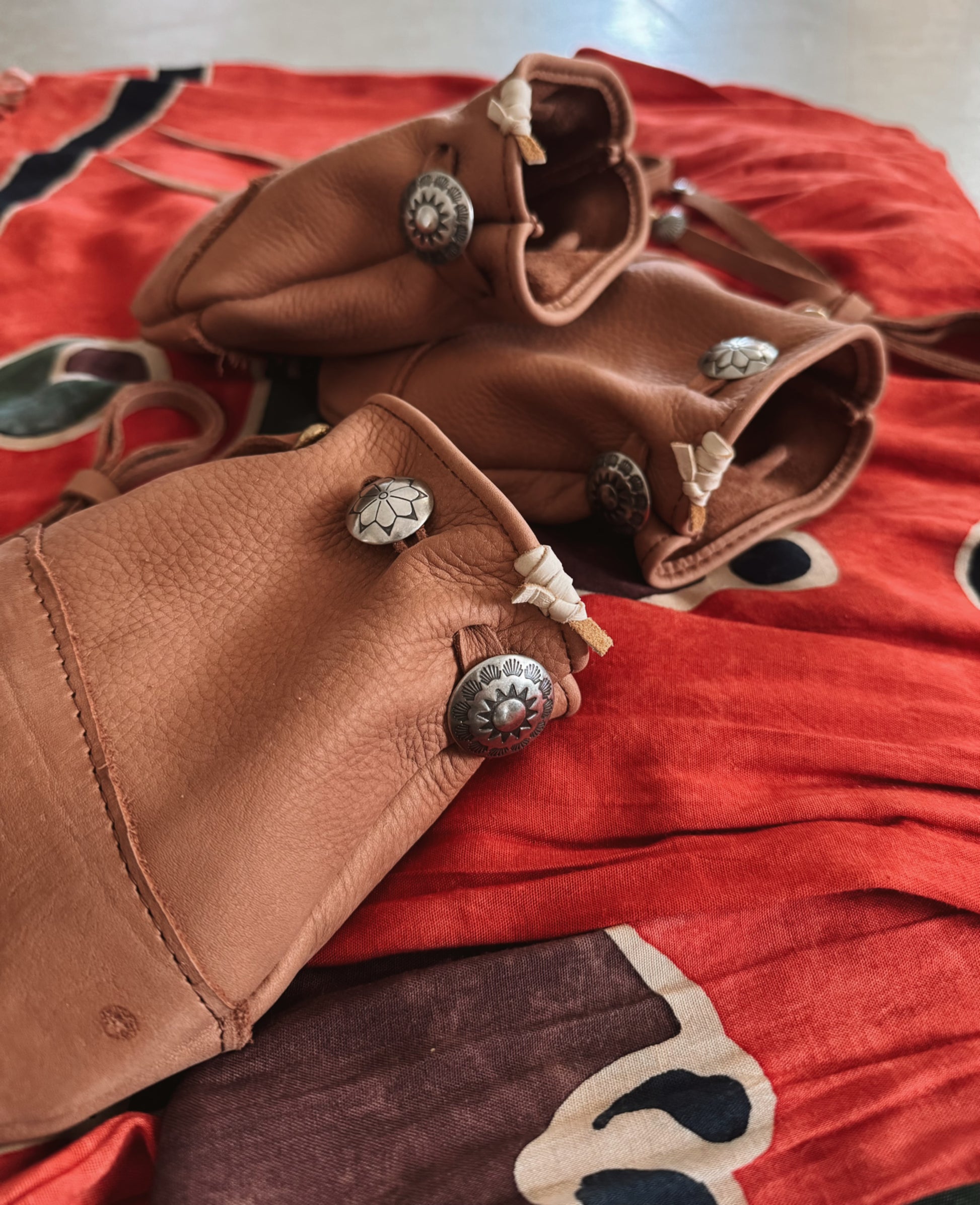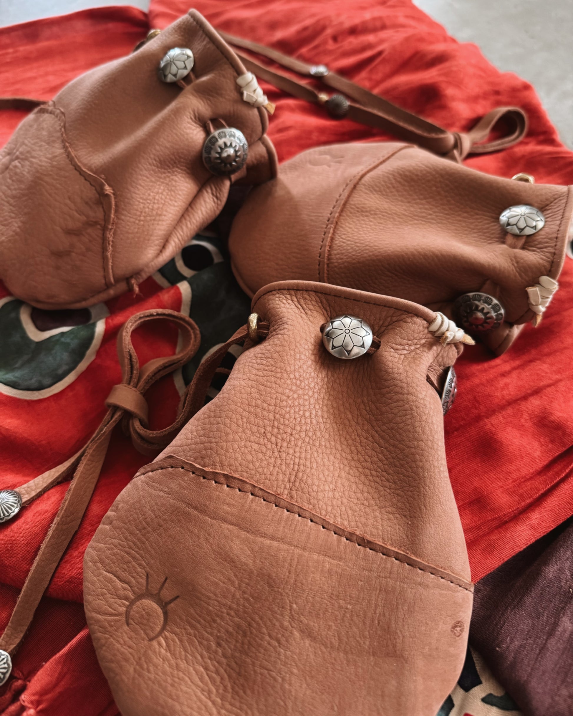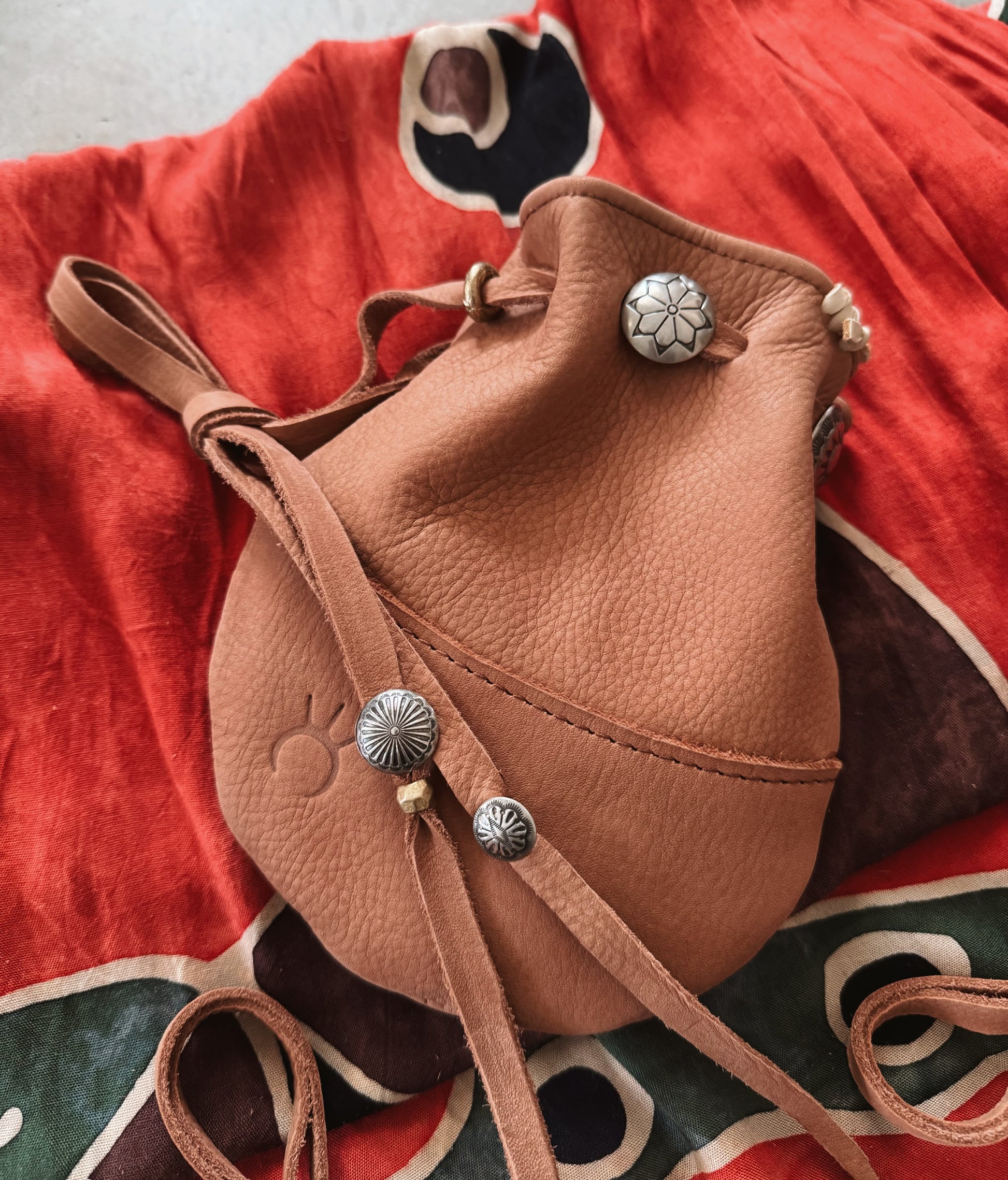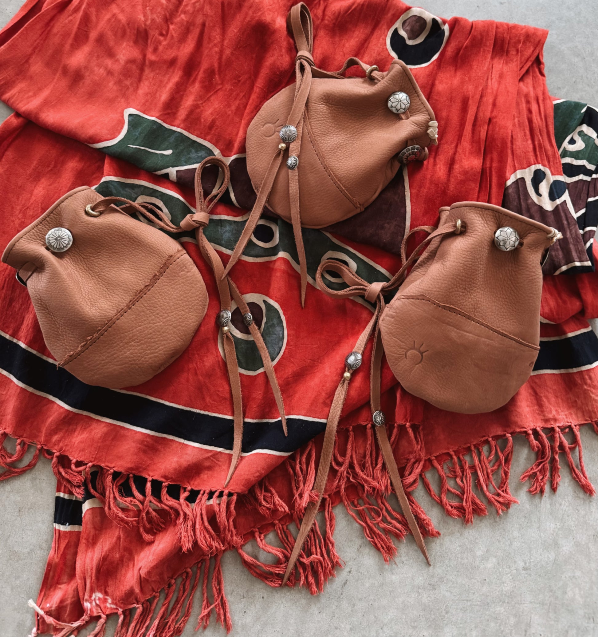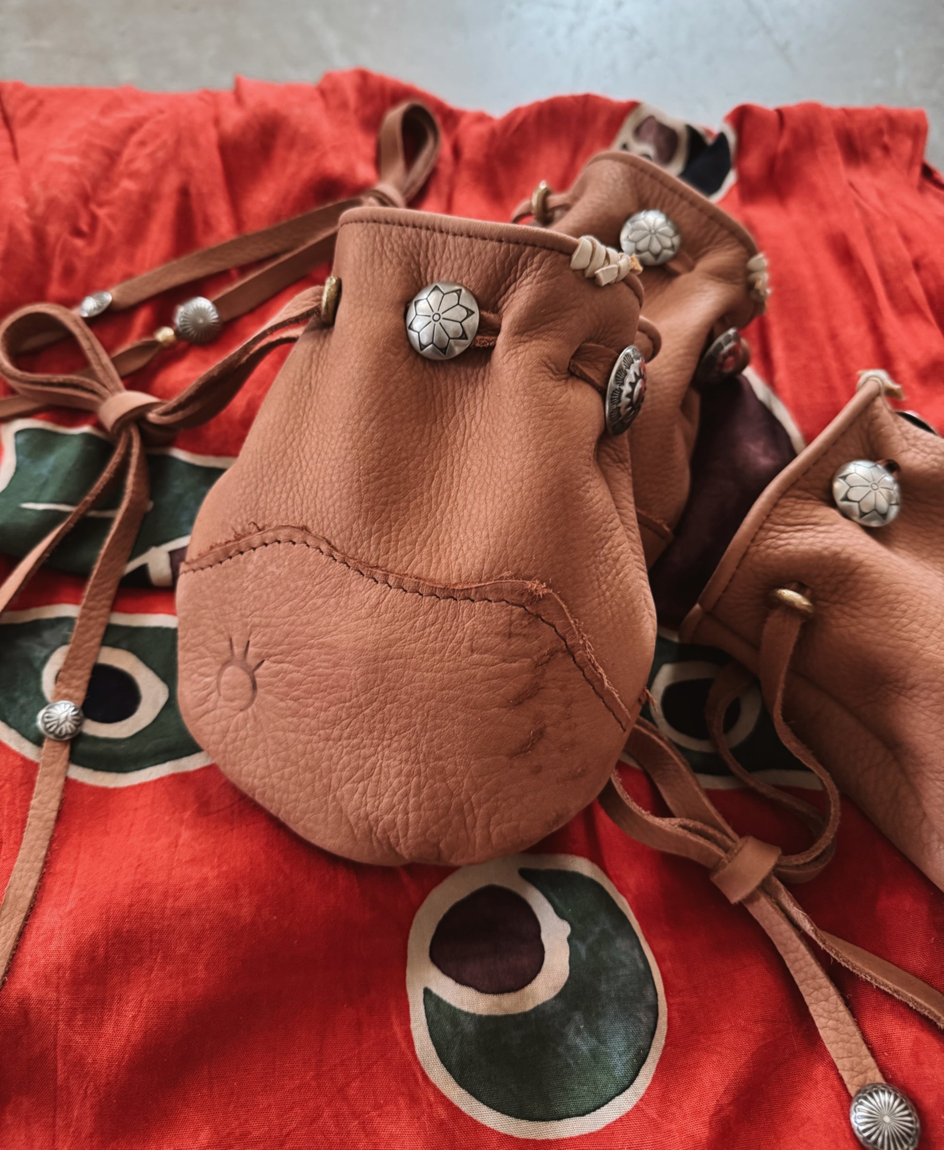 all pouches come with the same beads and conchos, they only vary with the roughed out design on the body. all come in the same size.
