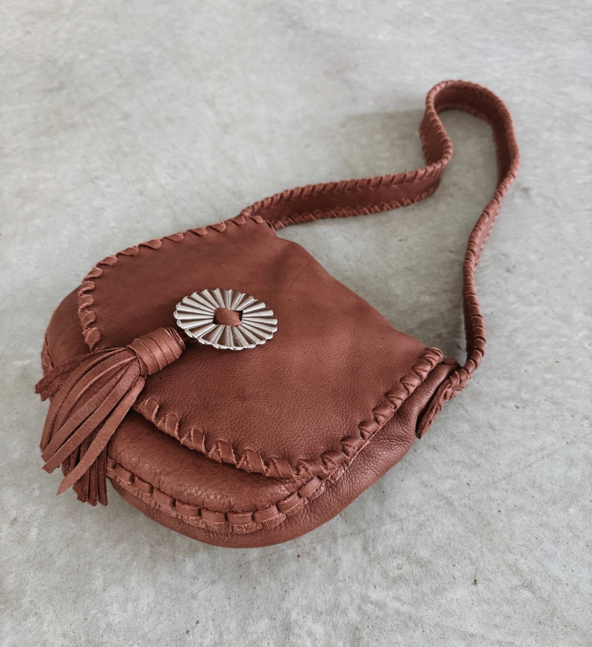 a timeless large sunburst concho and fringe tassel to decorate the flap. the strap is laced, the flap is laced, the edges are laced, the front is laced, the back is laced, the pocket is laced, the fringe is laced, this bag is truly Laced Up!